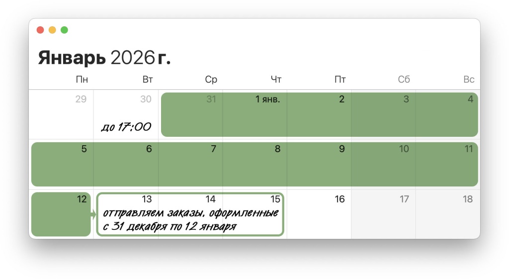 Заказы, оформленные после 17:00 30 декабря, будут упакованы и отправлены 13–15 января.