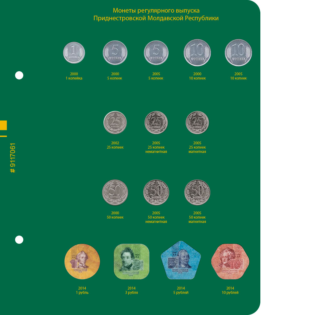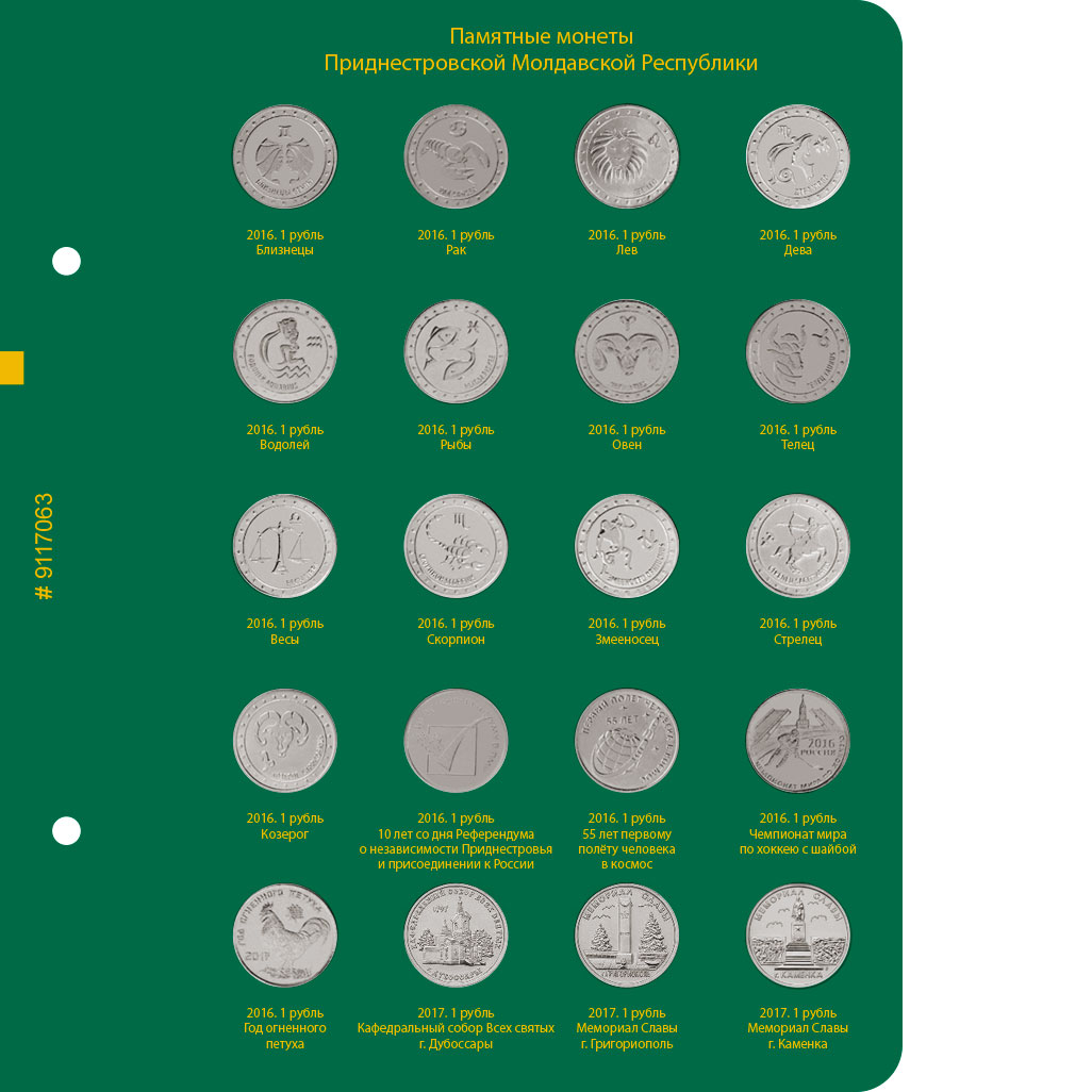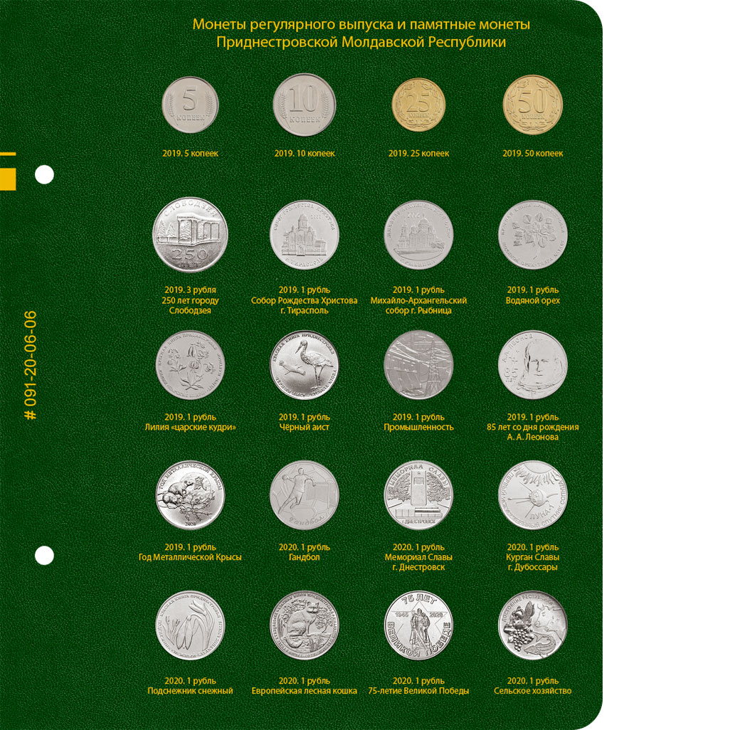 В альбоме подписаны ячейки для монет Приднестровья регулярного чекана и юбилейных и памятных монет номиналом 1 и 3 рубля.