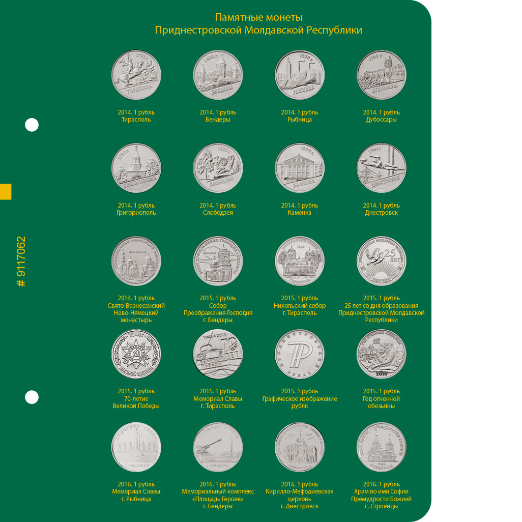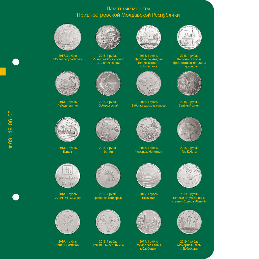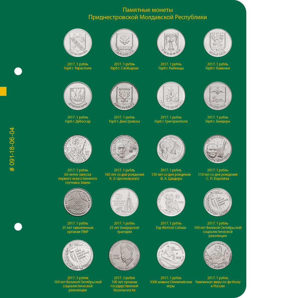 В альбоме подписаны ячейки для монет Приднестровья регулярного чекана и юбилейных и памятных монет номиналом 1 и 3 рубля.