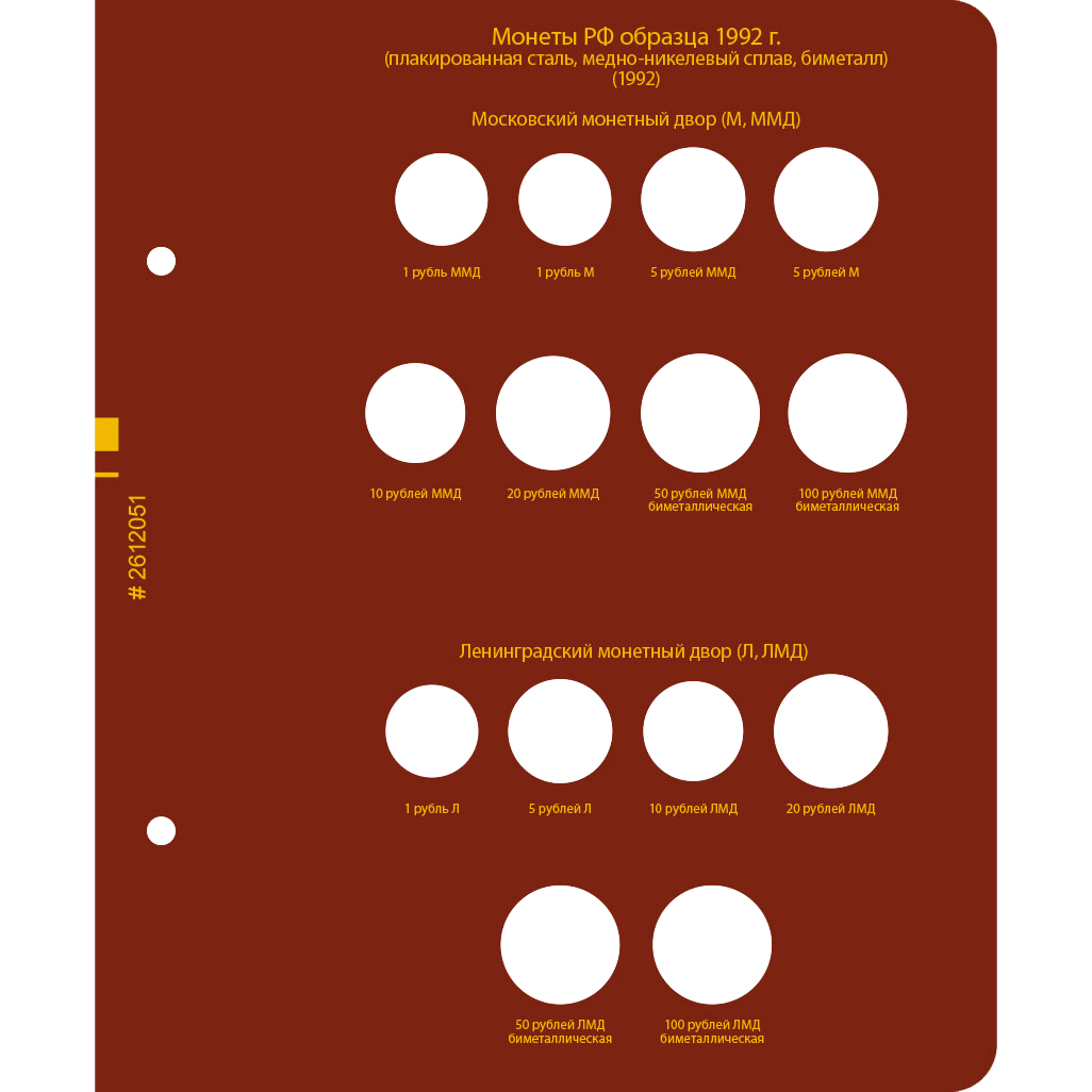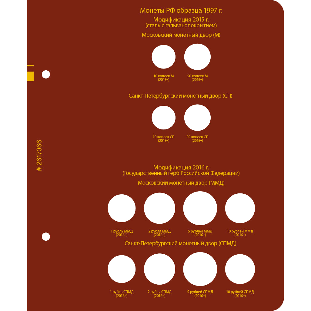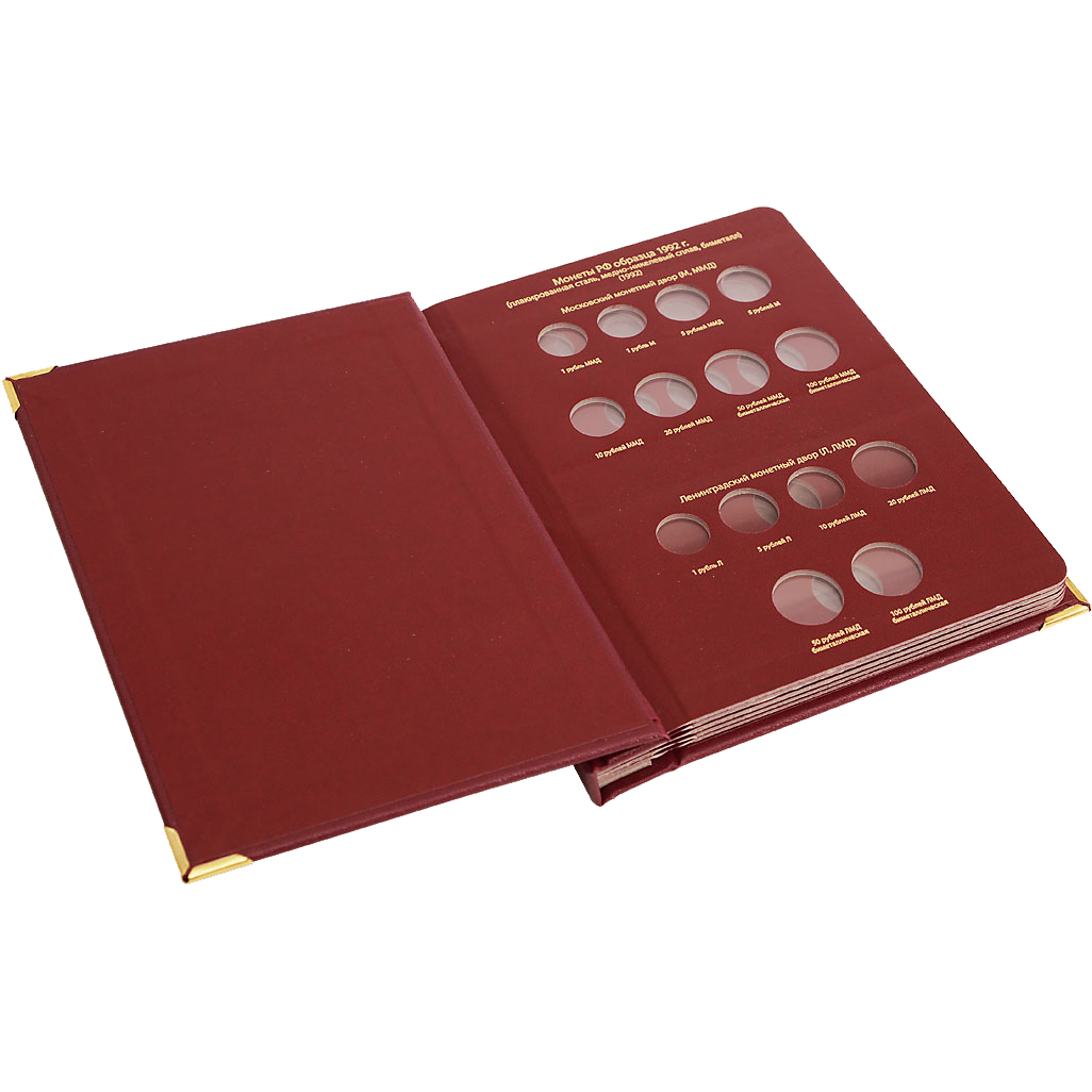 В альбоме подписаны ячейки для монет России с 1992 по 2016 год по образцам. В альбоме учитываются разновидности по металлу, изображению, знаку монетного двора.