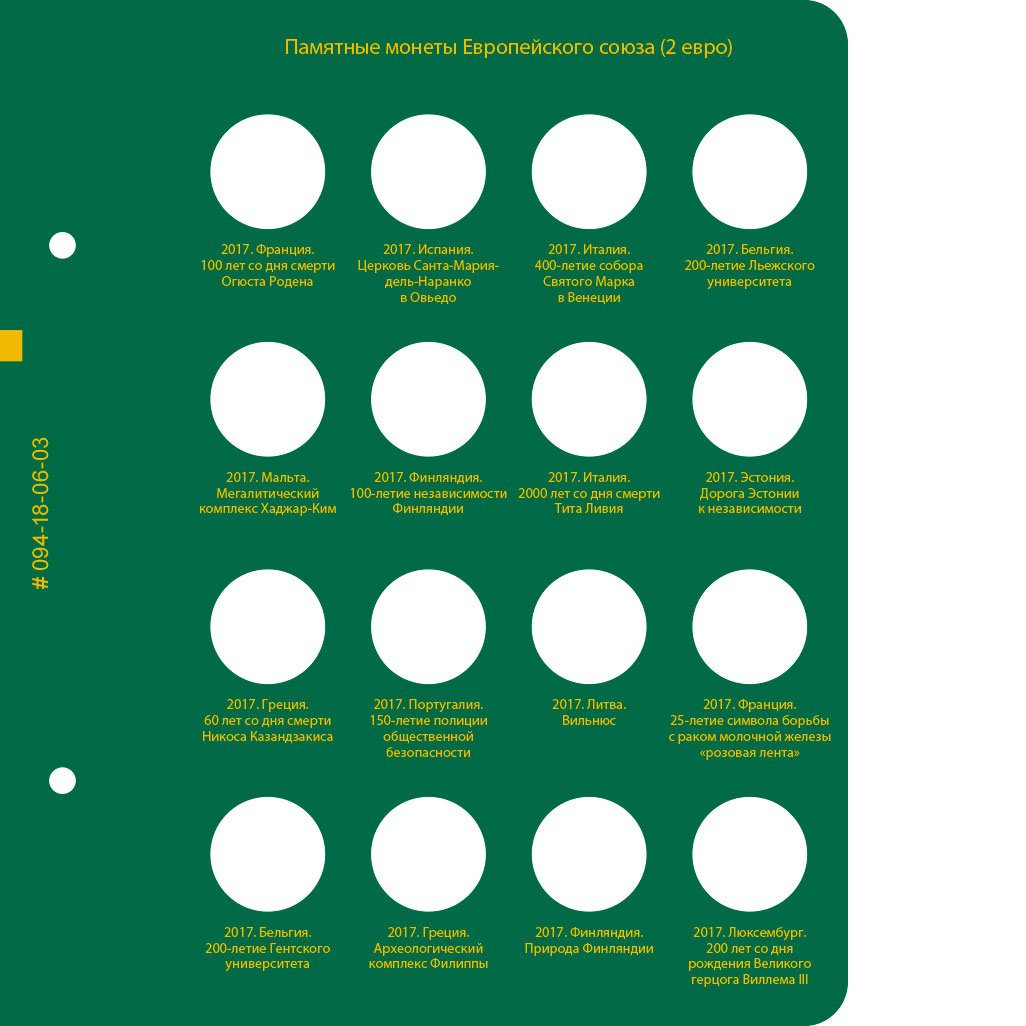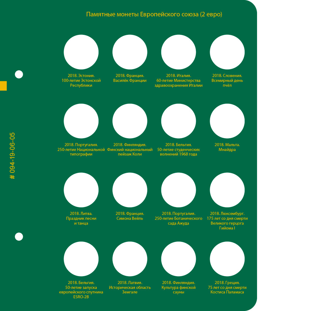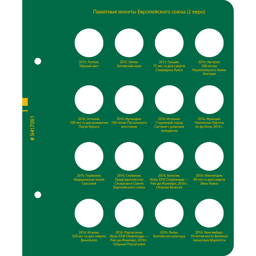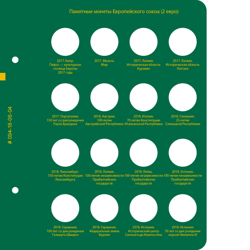 В альбоме подписаны ячейки для юбилейных монет номиналом 2 евро с 2015 по 2018 год. В альбоме учитываются монеты всех стран, кроме Андорры, Ватикана, Монако и Сан-Марино.