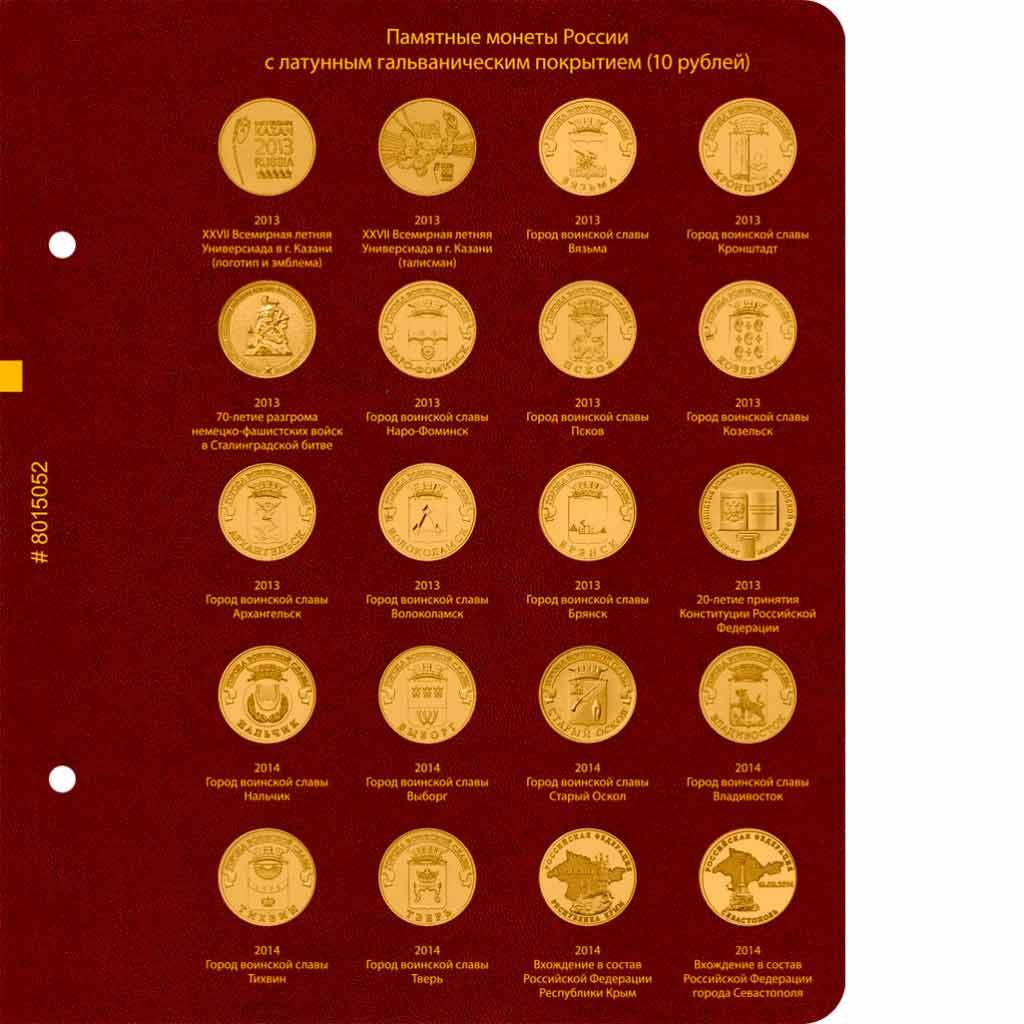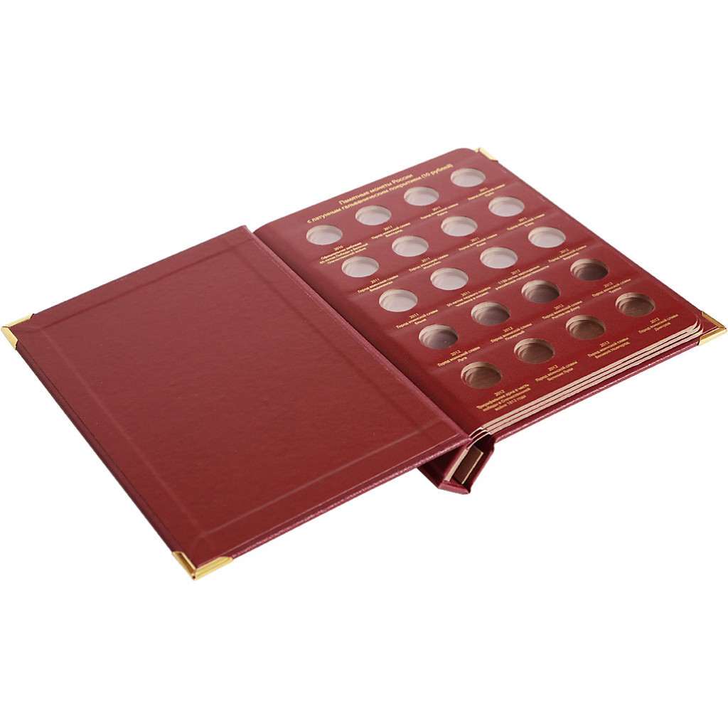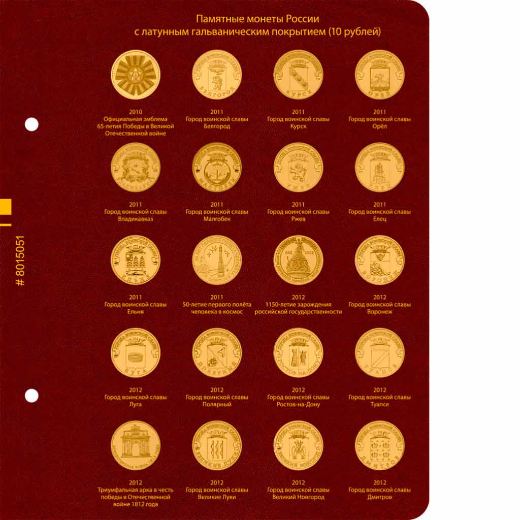 В альбоме подписаны ячейки для всех стальных монет России номиналом 10 рублей. Альбом предназначен для монет большой серии "Города Воинской Славы" и других монет.
