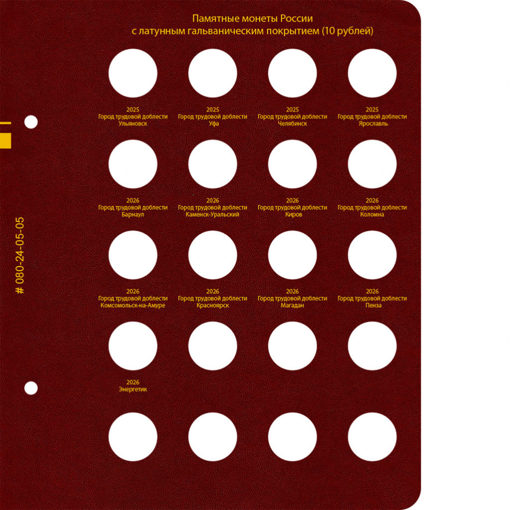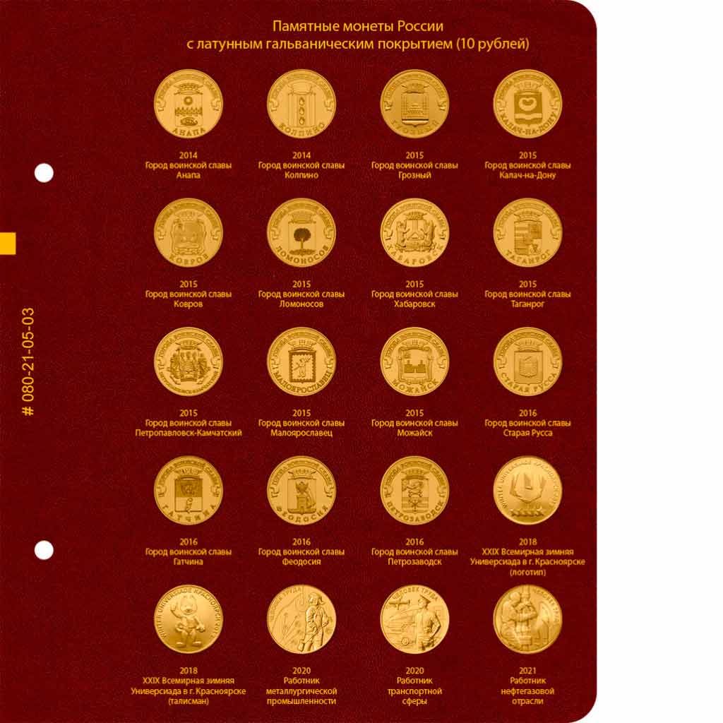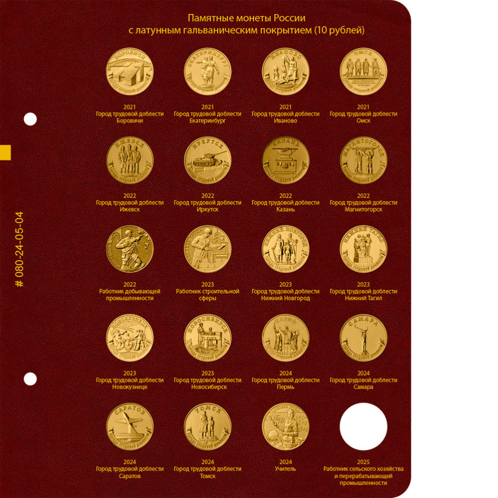 В альбоме подписаны ячейки для всех стальных монет России номиналом 10 рублей. Альбом предназначен для монет большой серии "Города Воинской Славы" и других монет.