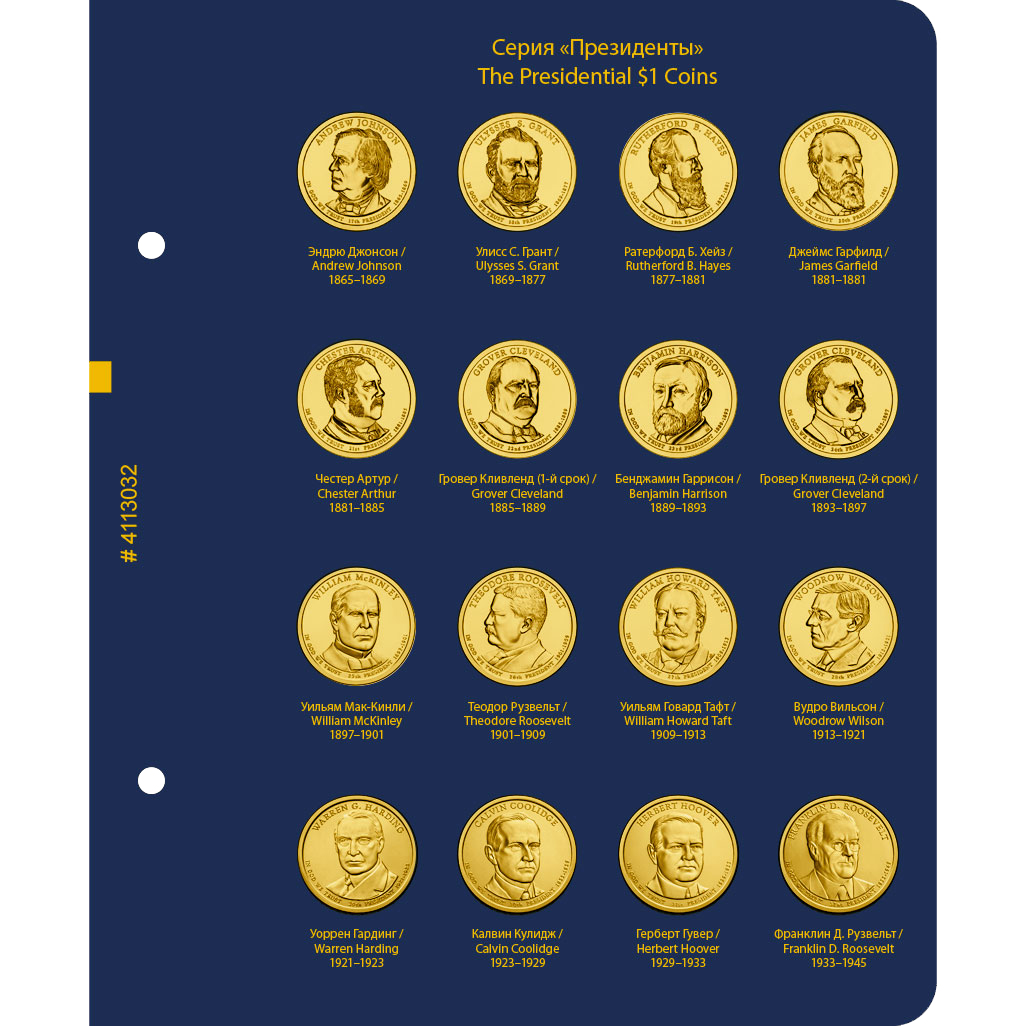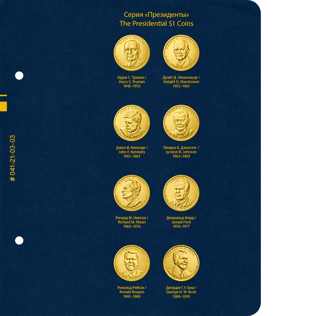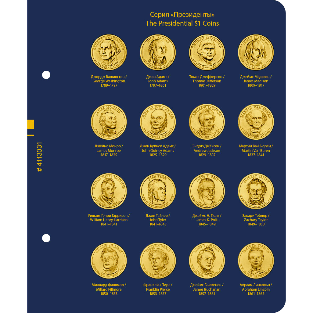 В альбоме подписаны ячейки для монет США серии "Президенты США" номиналом 1 доллар. Монетные дворы не учитываются.