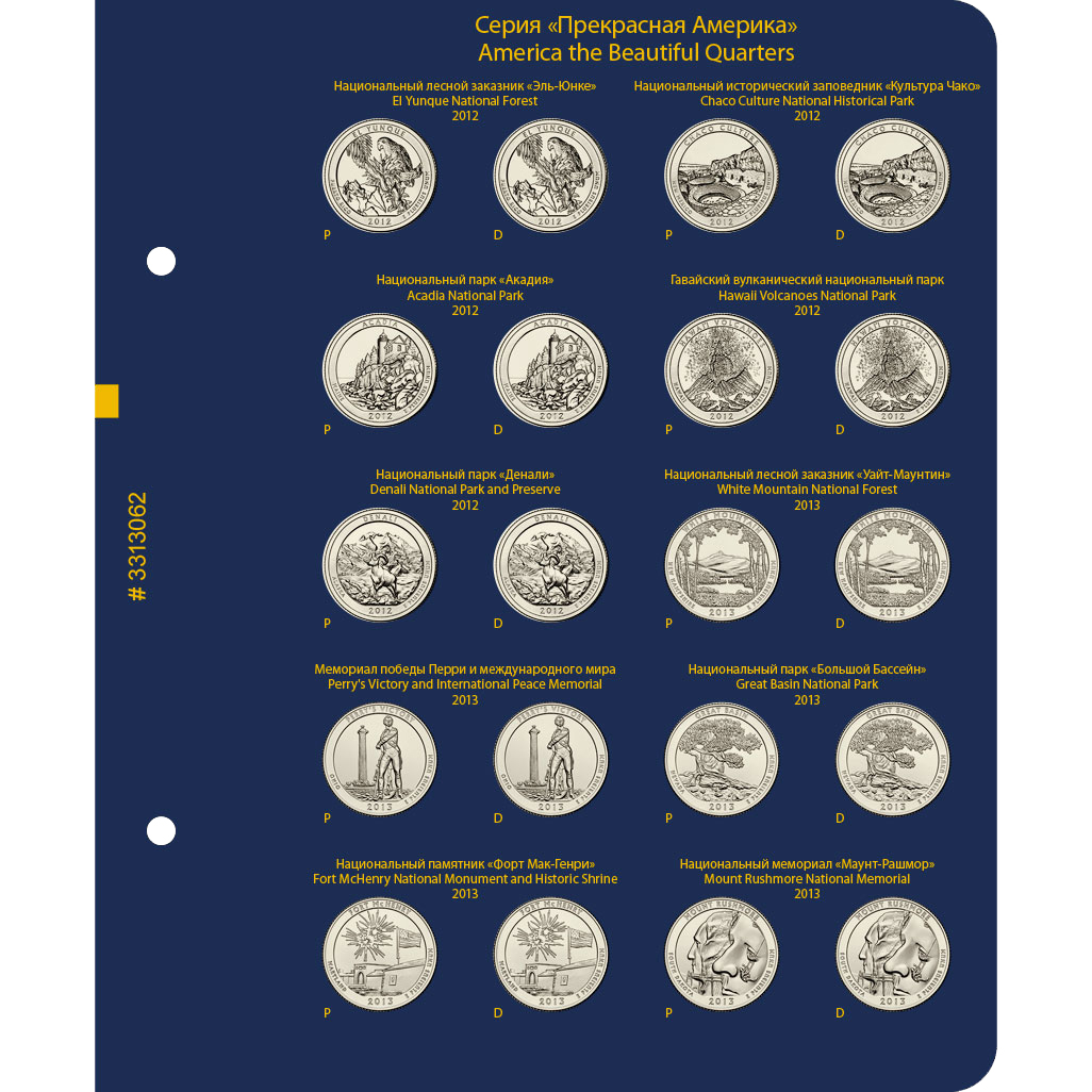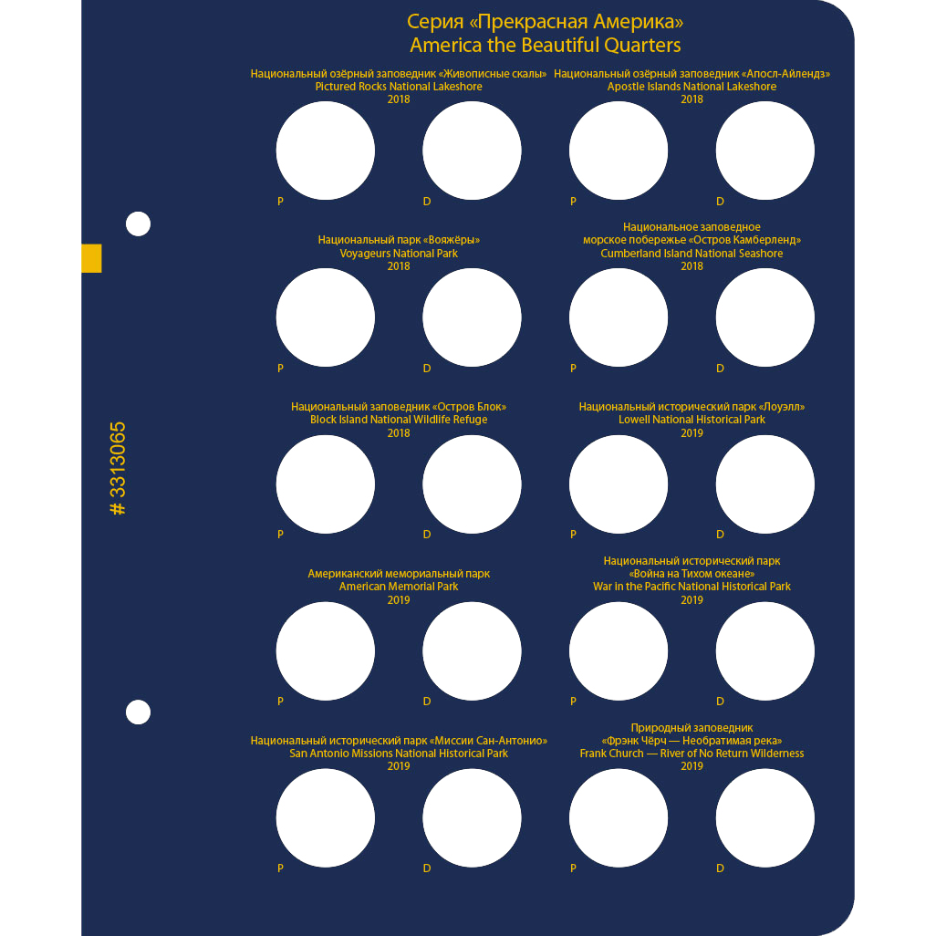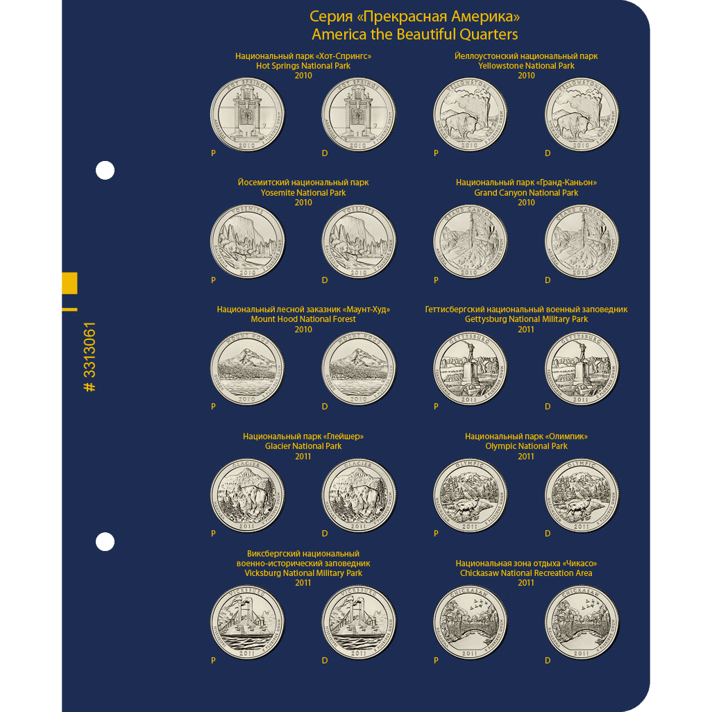 В альбоме подписаны ячейки для монет США серии "Прекрасная Америка / Национальные парки США" номиналом 25 центов. Ячейки подписаны для двух монетных дворов — P и D.