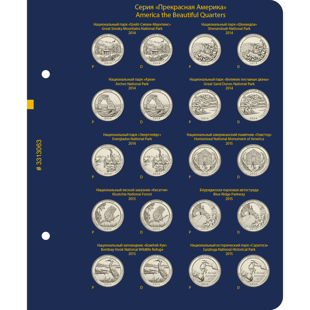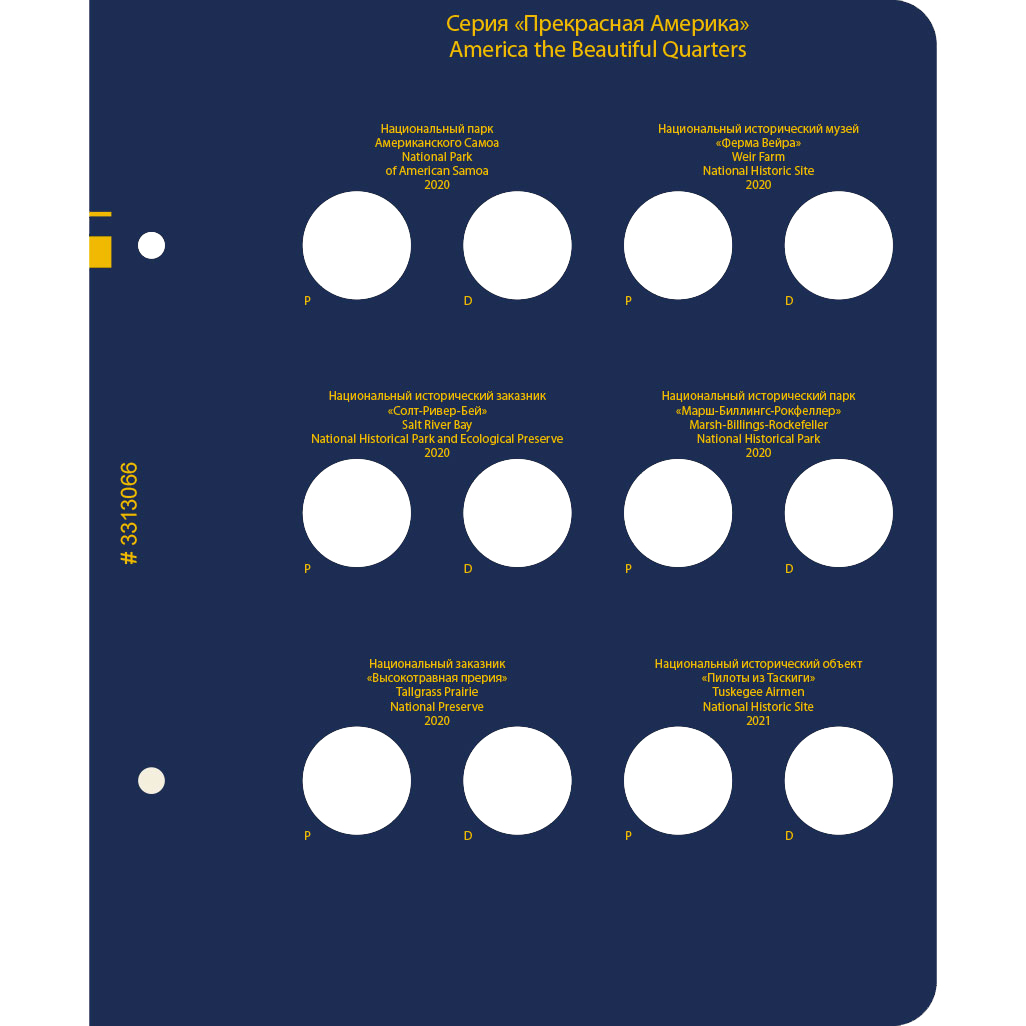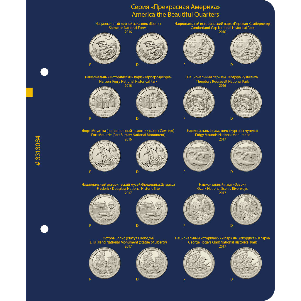 В альбоме подписаны ячейки для монет США серии "Прекрасная Америка / Национальные парки США" номиналом 25 центов. Ячейки подписаны для двух монетных дворов — P и D.