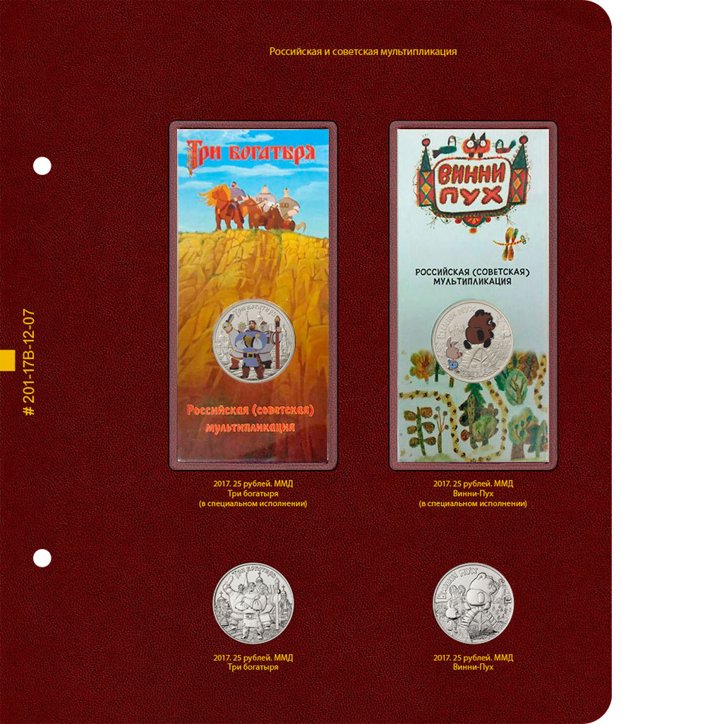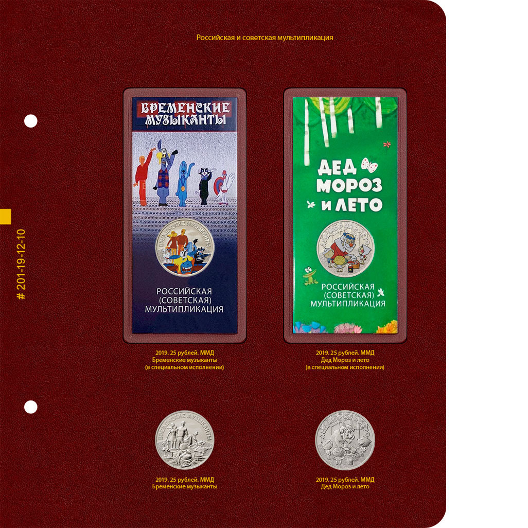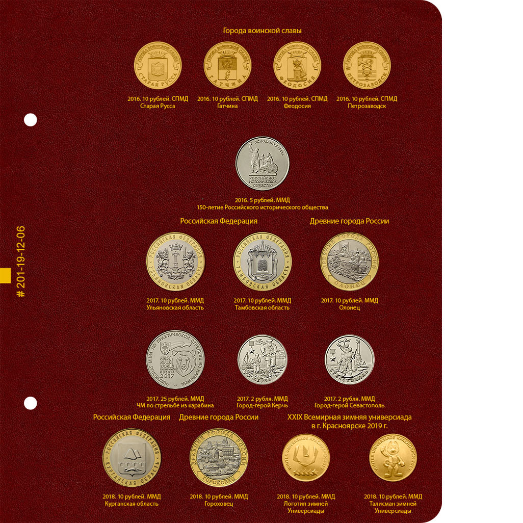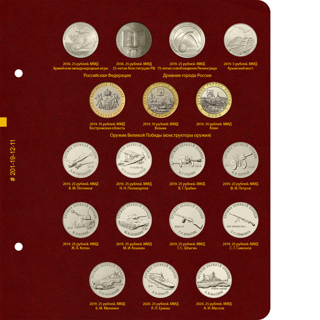 В альбоме учитываются все памятные и юбилейные монеты России с 1999 года. В альбоме подписаны ячейки для монет номиналом 1, 2, 5, 10 и 25 рублей. Есть разделение на московский и санкт-петербургский монетные дворы. Есть ячейки для цветных монет в официальных блистерах.