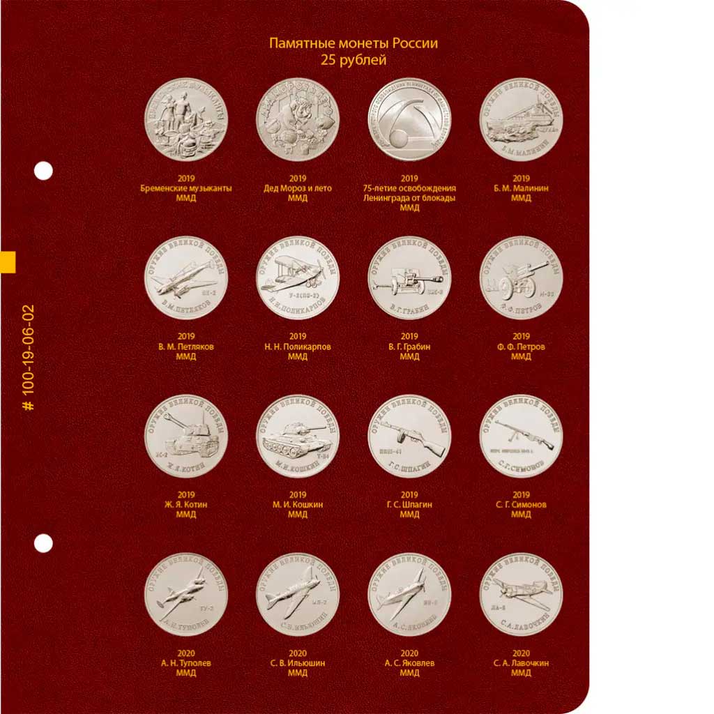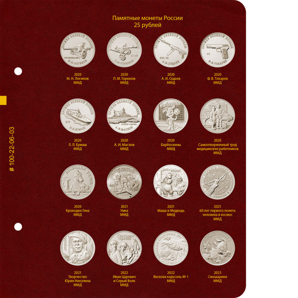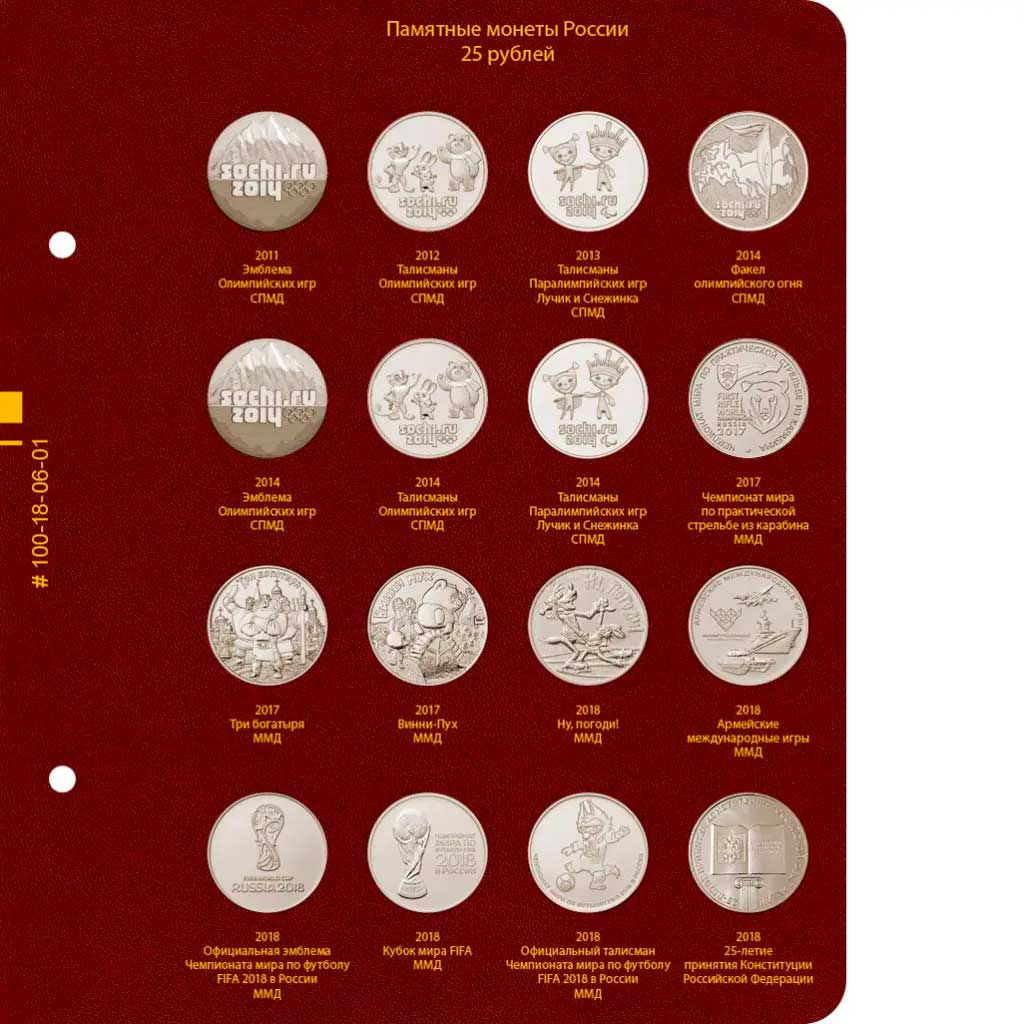 В альбоме подписаны ячейки для монет России номиналом 25 рублей в простом исполнении. В альбоме не учитываются цветные монеты в блистерах.