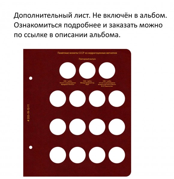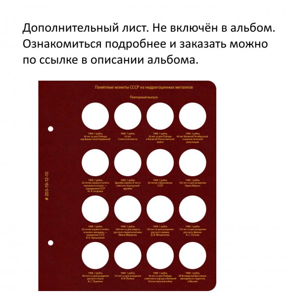 Альбом можно дополнить листами для серий "50 лет Победы в ВОВ", "300 лет Российского флота", а также повторного выпуска 1988 года и разновидностей. Эти листы продаются отдельно.