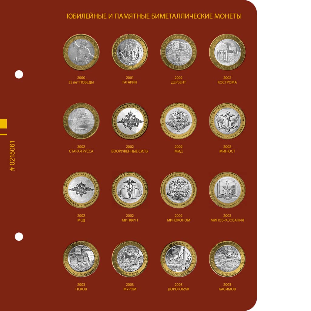 В альбоме подписаны ячейки для биметаллических монет России номиналом 10 рублей. Монетные дворы не учитываются.
