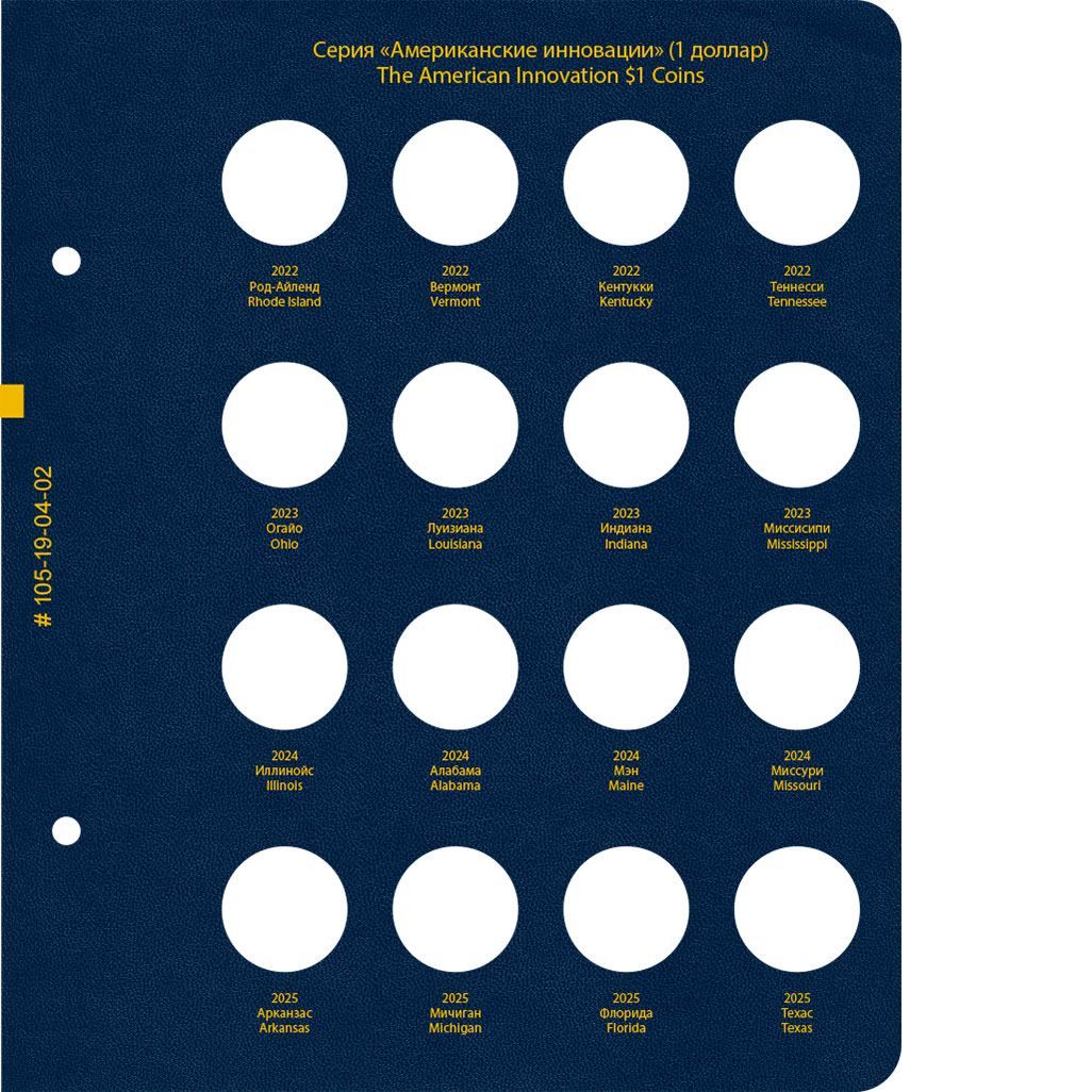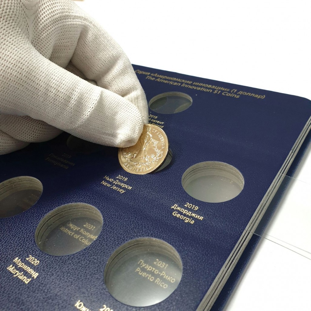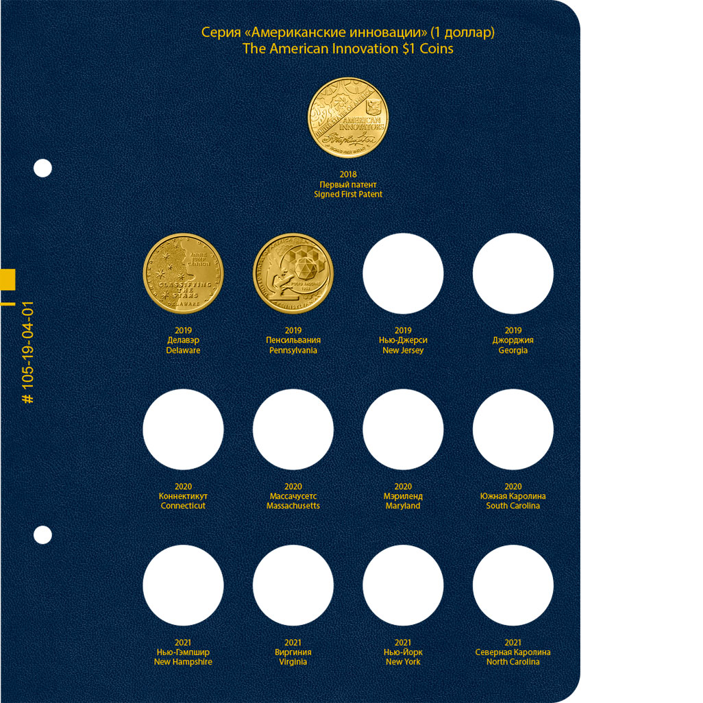 В альбоме подписаны ячейки для монет США серии "Американские инновации" номиналом 1 доллар. Монетные дворы не учитываются.