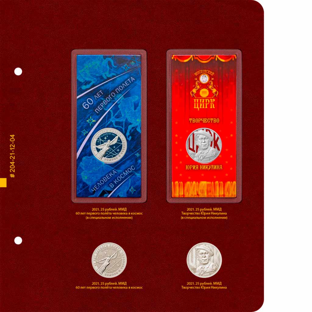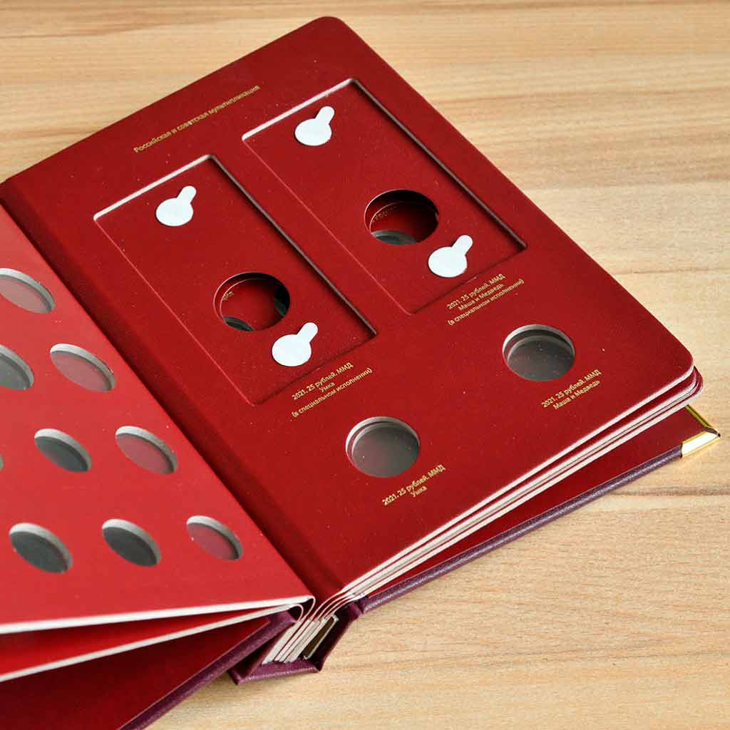 В альбоме учитываются все памятные и юбилейные монеты России с 1999 года. В альбоме подписаны ячейки для монет номиналом 1, 2, 5, 10 и 25 рублей. Есть разделение на московский и санкт-петербургский монетные дворы. Есть ячейки для цветных монет в официальных блистерах.