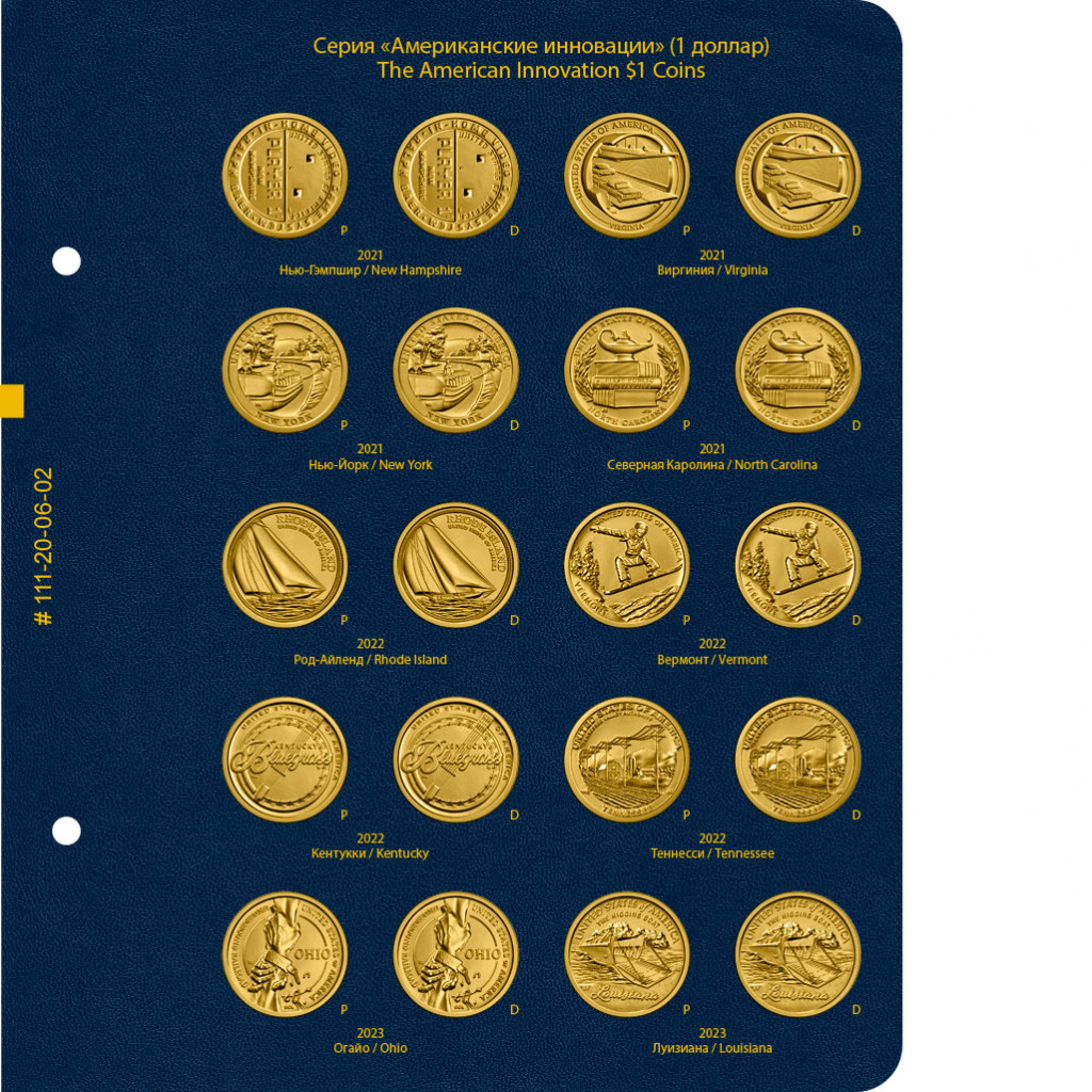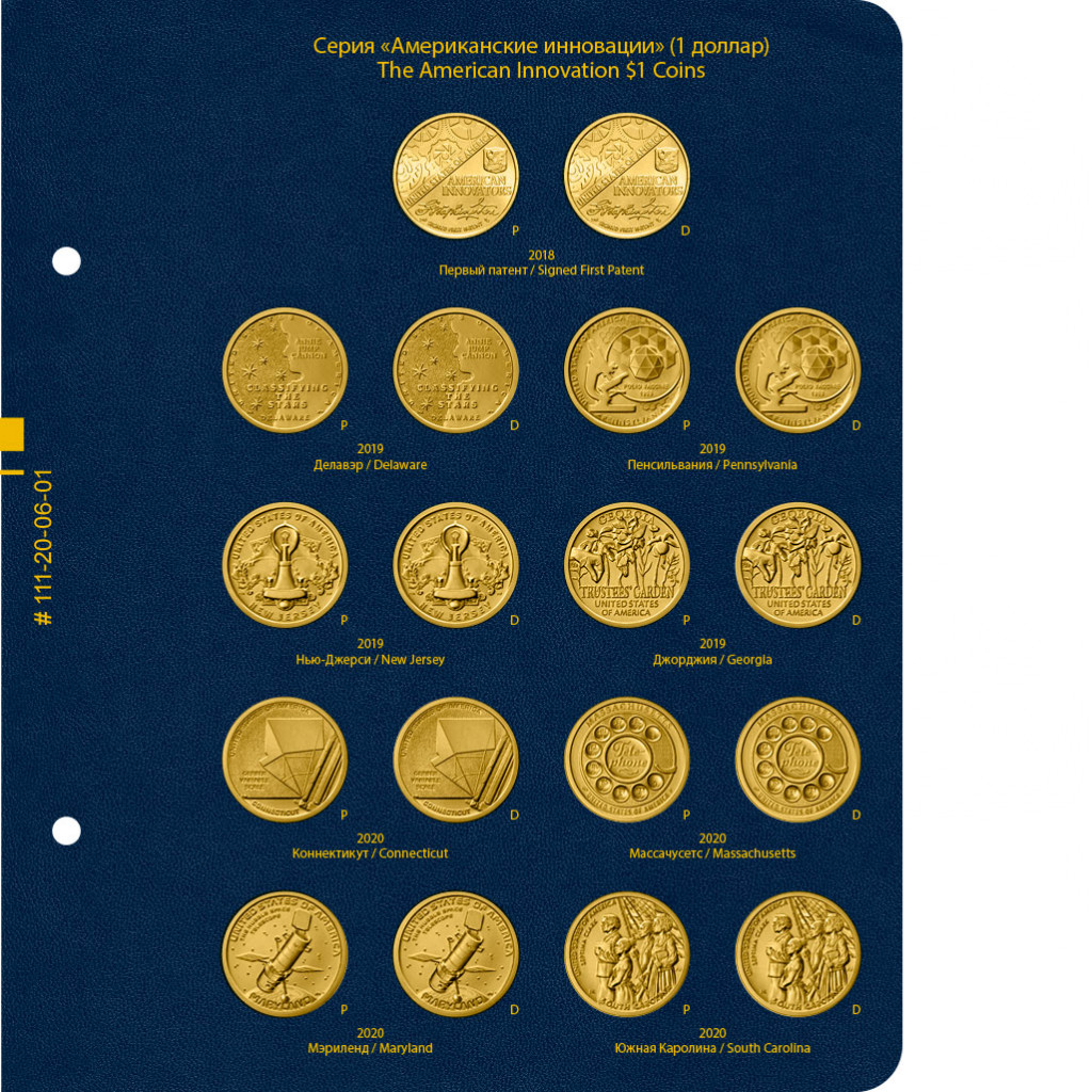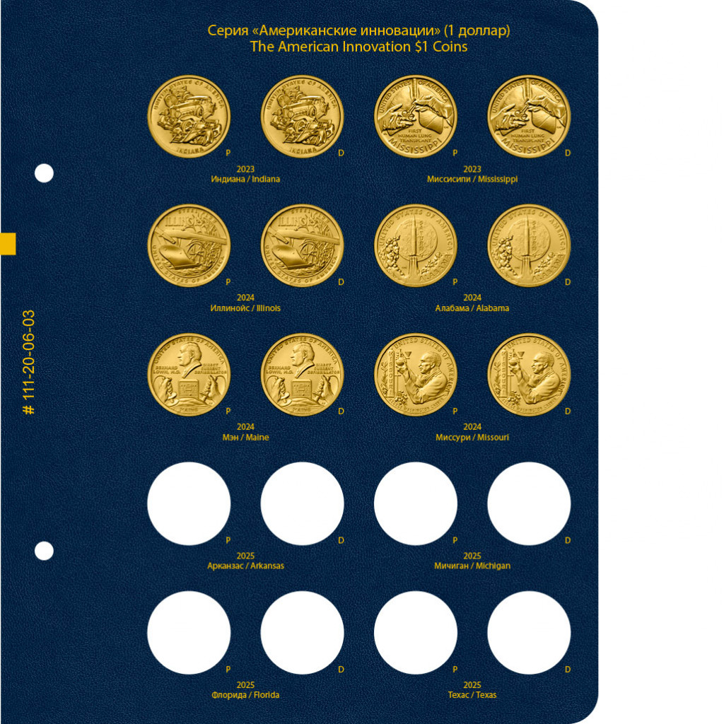 В альбоме подписаны ячейки для монет США серии "Американские инновации" номиналом 1 доллар. Учитываются монетные дворы — P и D.