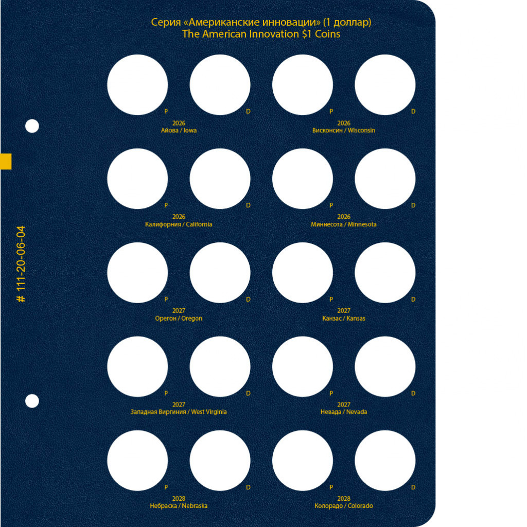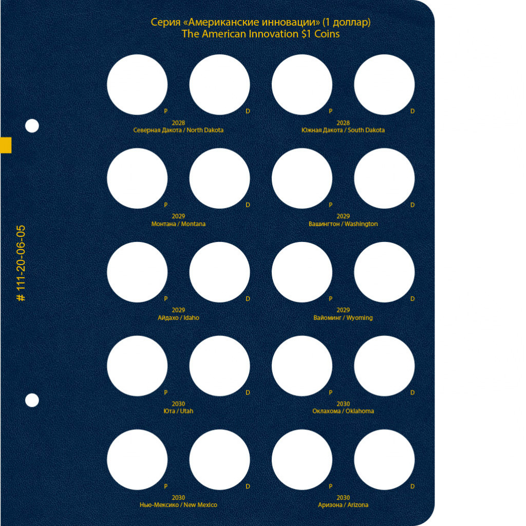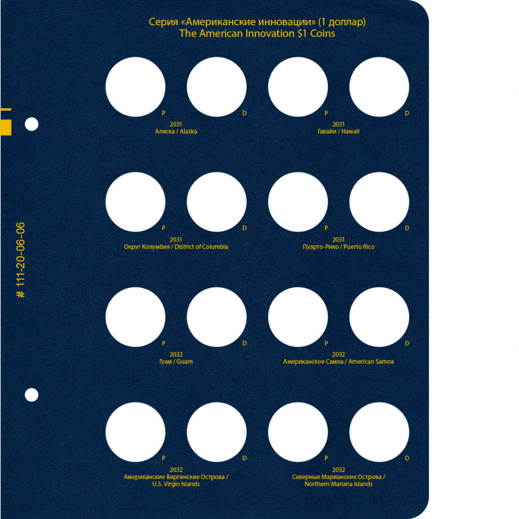 В альбоме подписаны ячейки для монет США серии "Американские инновации" номиналом 1 доллар. Учитываются монетные дворы — P и D.