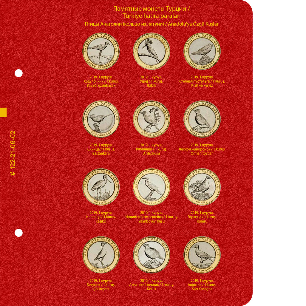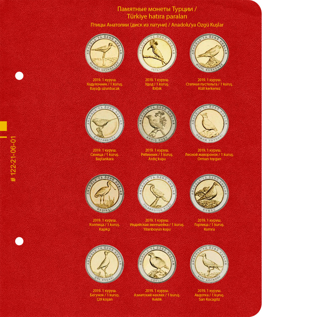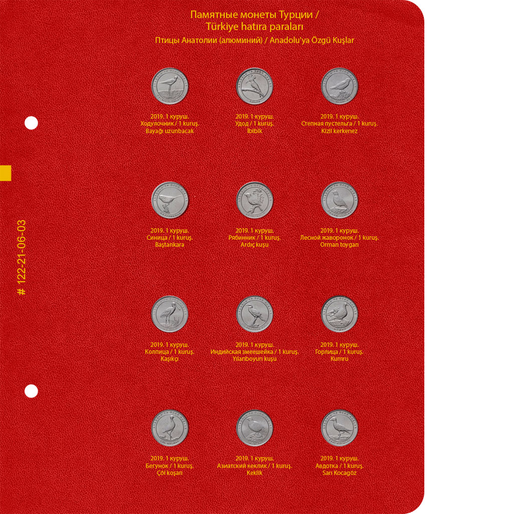 В альбоме подписаны ячейки для монет 2019 года: биметаллические и алюминиевые монеты серии «Птицы Анатолии / Малой Азии». Также в альбоме есть накопительный лист без подписей.