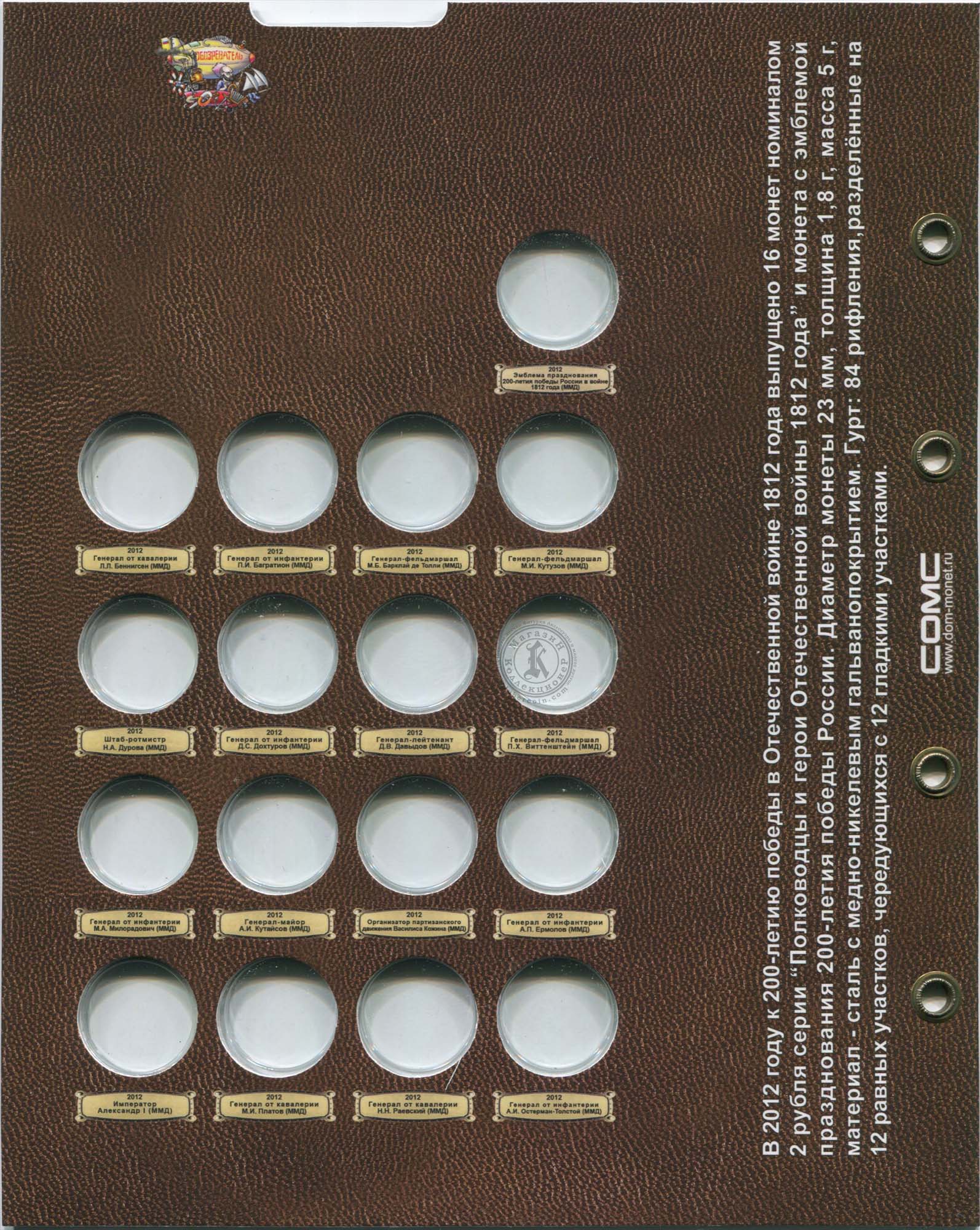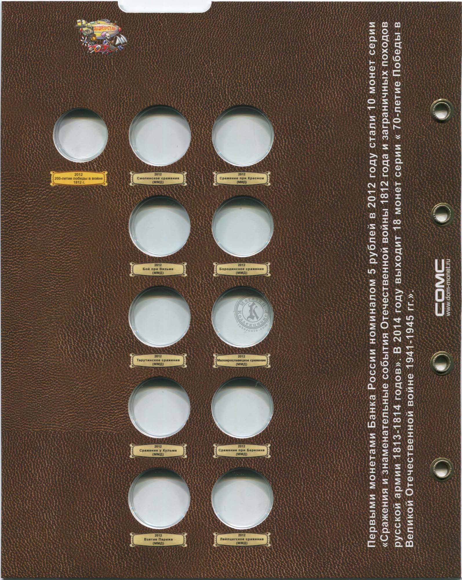 На листах подписаны ячейки для монет России серии "Отечественная война 1812 года" номиналом 2, 5 и 10 рублей.