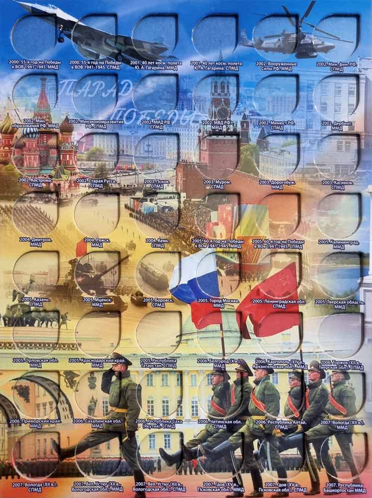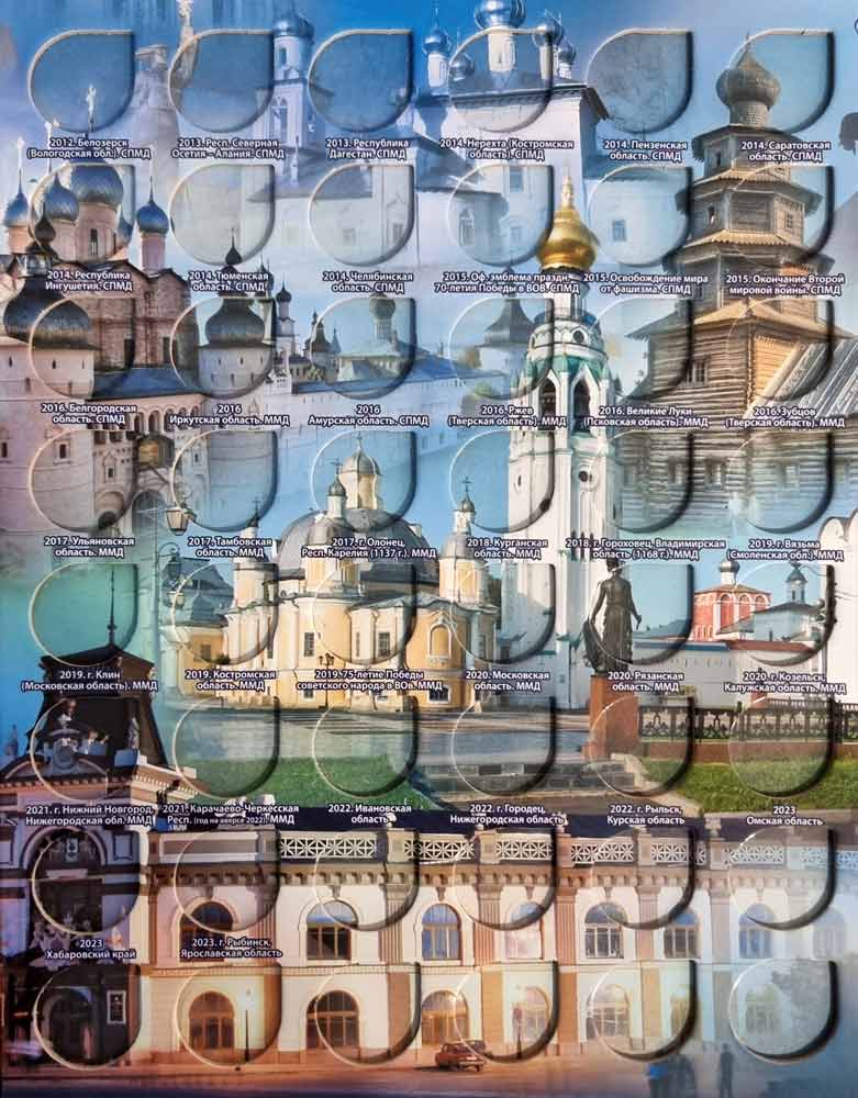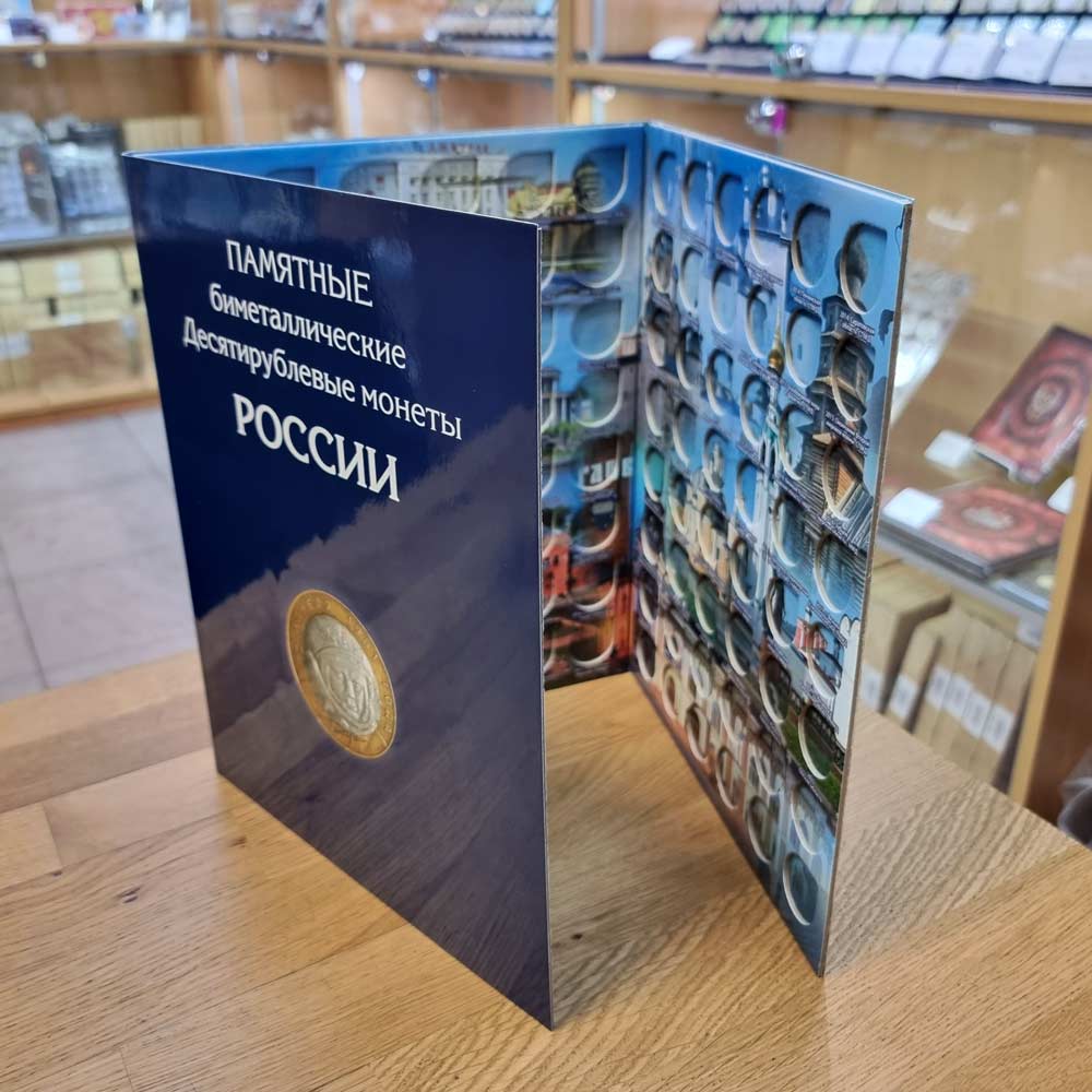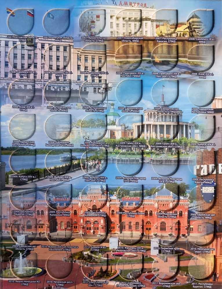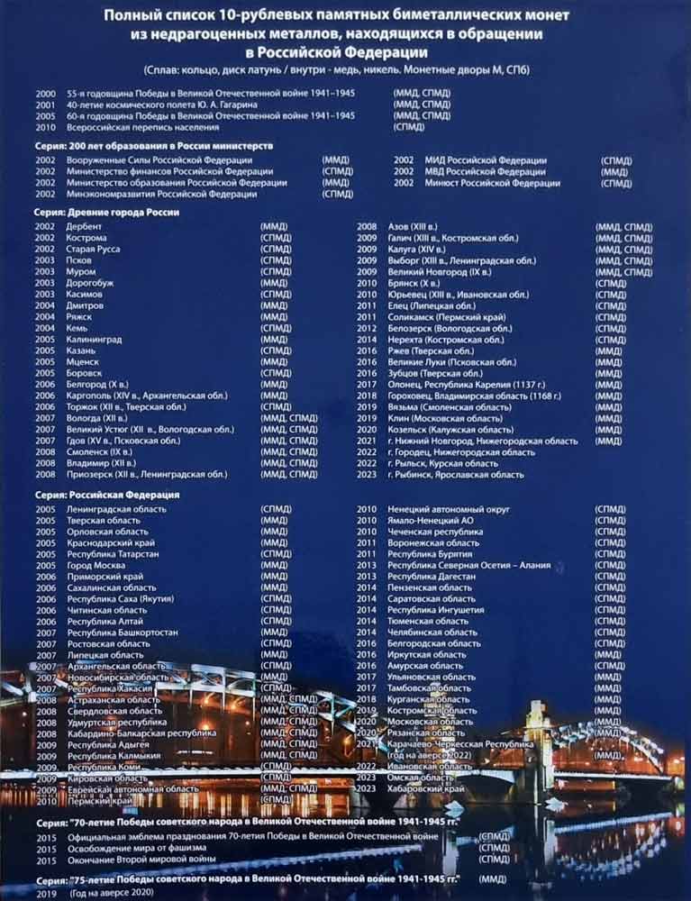 В планшете подписаны ячейки для всех биметаллических монет России номиналом 10 рублей. Учитывается разделение на монетные дворы — московский и санкт-петербургский.