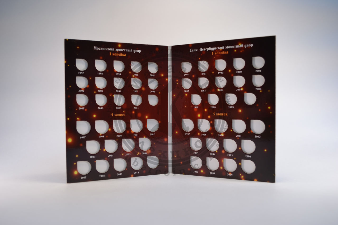 В альбоме подписаны ячейки для монет России регулярного чекана 1 копейка и 5 копеек с 1997 по 2014 год. Учитывается раздение на московский и санкт-петербургский монетные дворы.