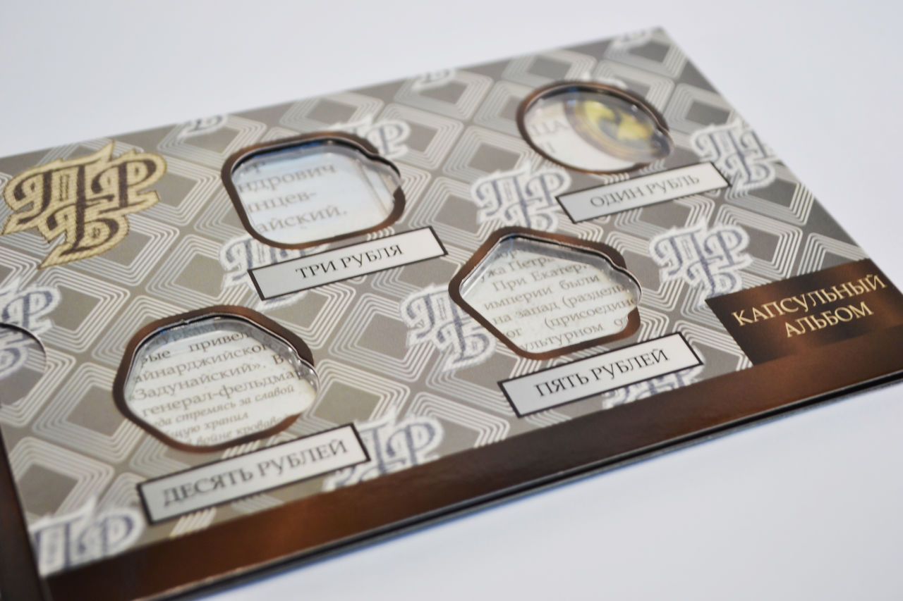 В альбоме подписаны ячейки для монет Приднестровья 1, 3, 5, 10 рублей 2014 из композитного материала.