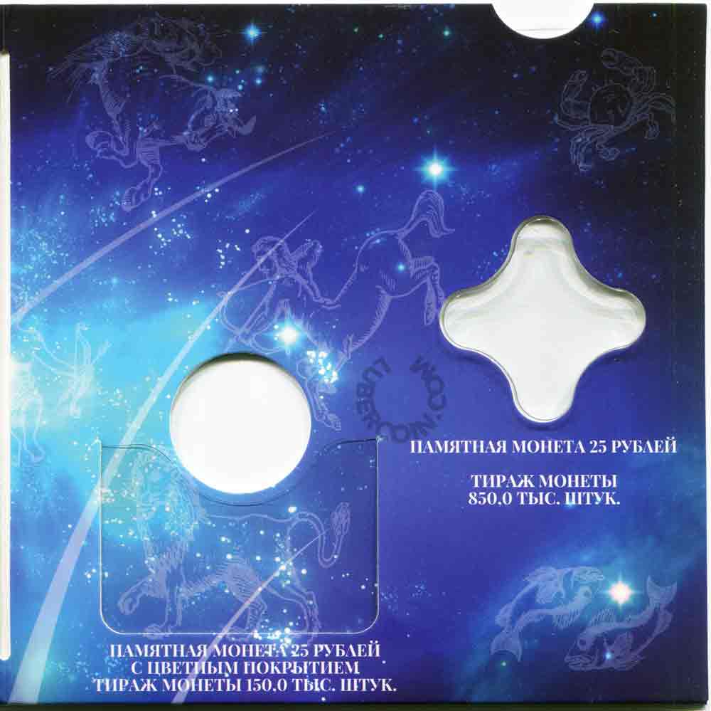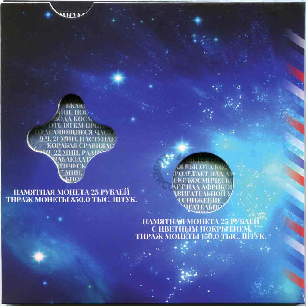 Альбом предназначен для хранения двух монет России серии «Космос»: 25 рублей в простом исполнении и 25 рублей с цветным покрытием в официальном блистере.