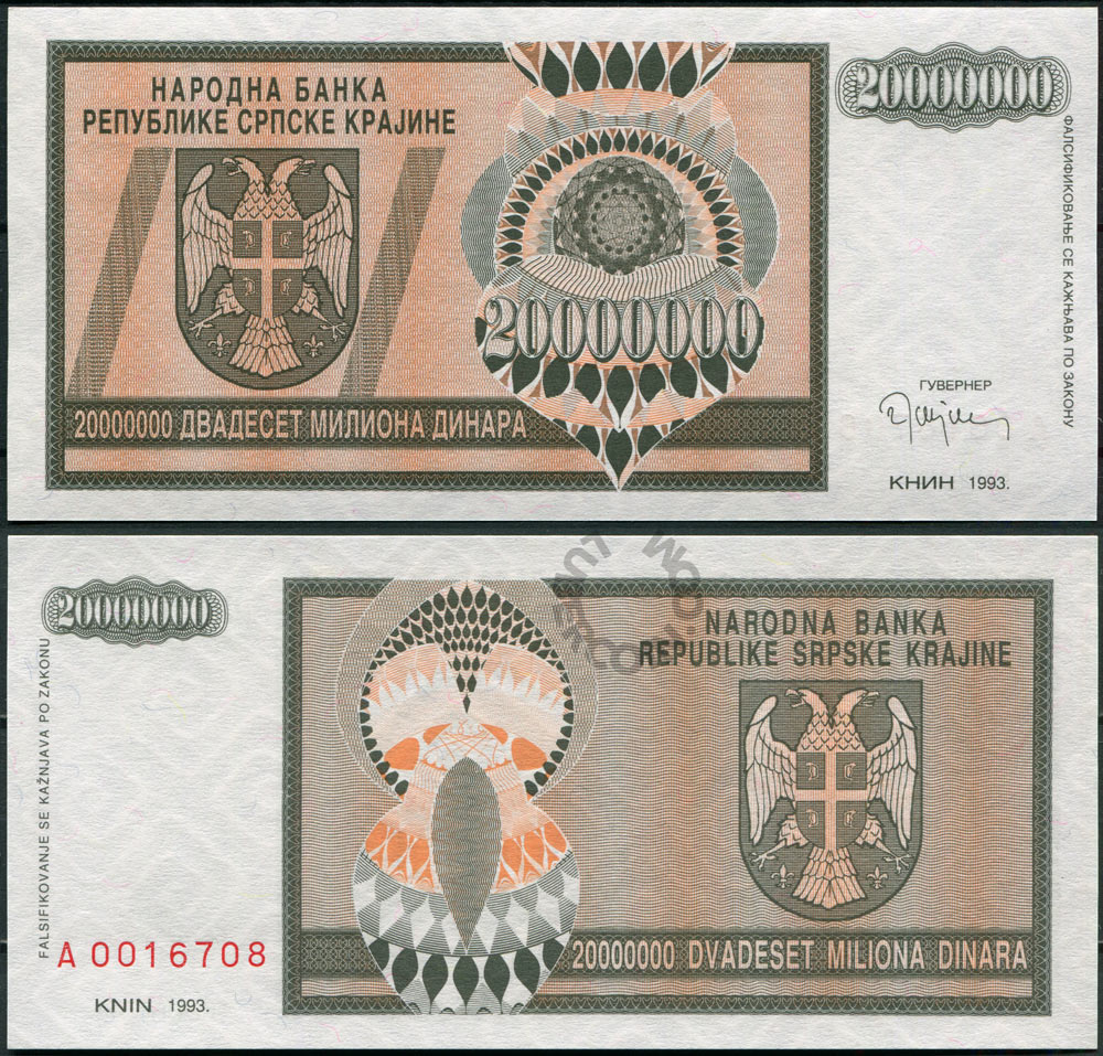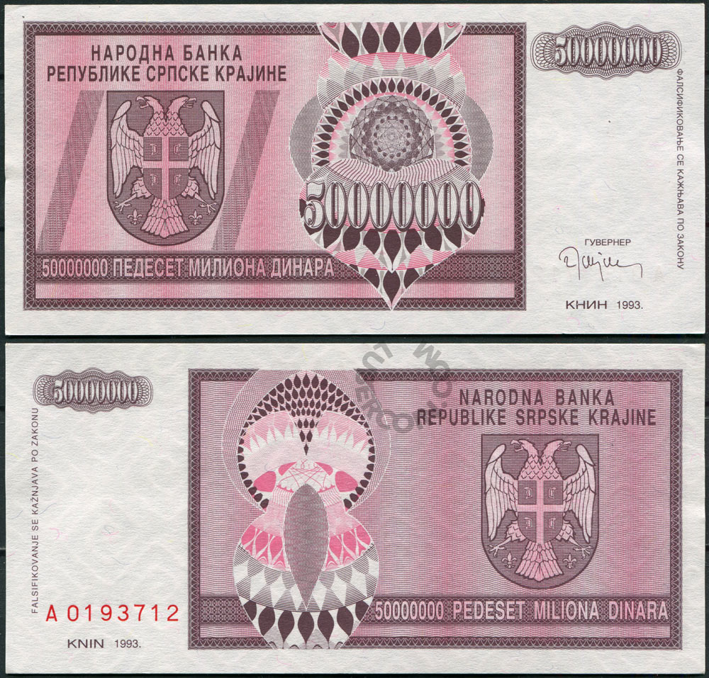 Сербская Краина 50000000 динар 1993 A UNC (Замят угол)