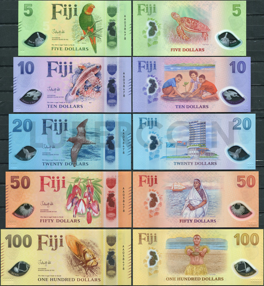 Фиджи набор банкнот 5, 10, 20, 50, 100 долларов ND (2026) AA03847.. Одинаковый номер (5 банкнот) UNC