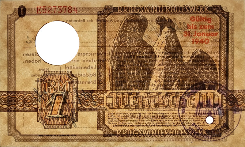 Германия (Третий Рейх) «Зимняя помощь». Сертификат. 1 рейхсмарка 1940. E5273784 (#Gr-WHW-10)
