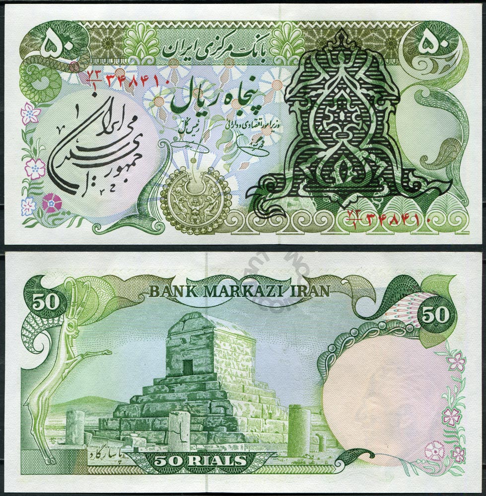 Иран 50 риалов ND (1979) Чёрная надпечатка на портрете UNC (Замяты углы)
