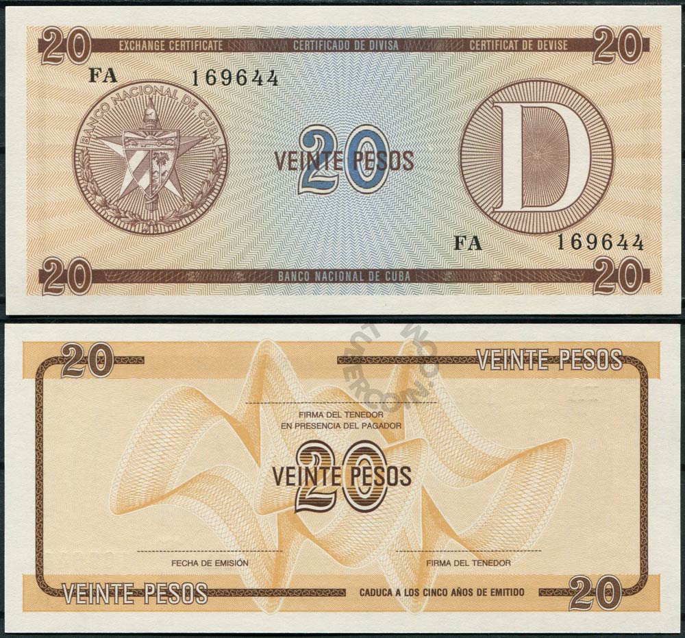 Куба набор банкнот (валютных сертификатов) 1, 3, 5, 10, 20 песо ND «D» Для студентов по обмену (5 банкнот) (Замяты углы. Пятна)