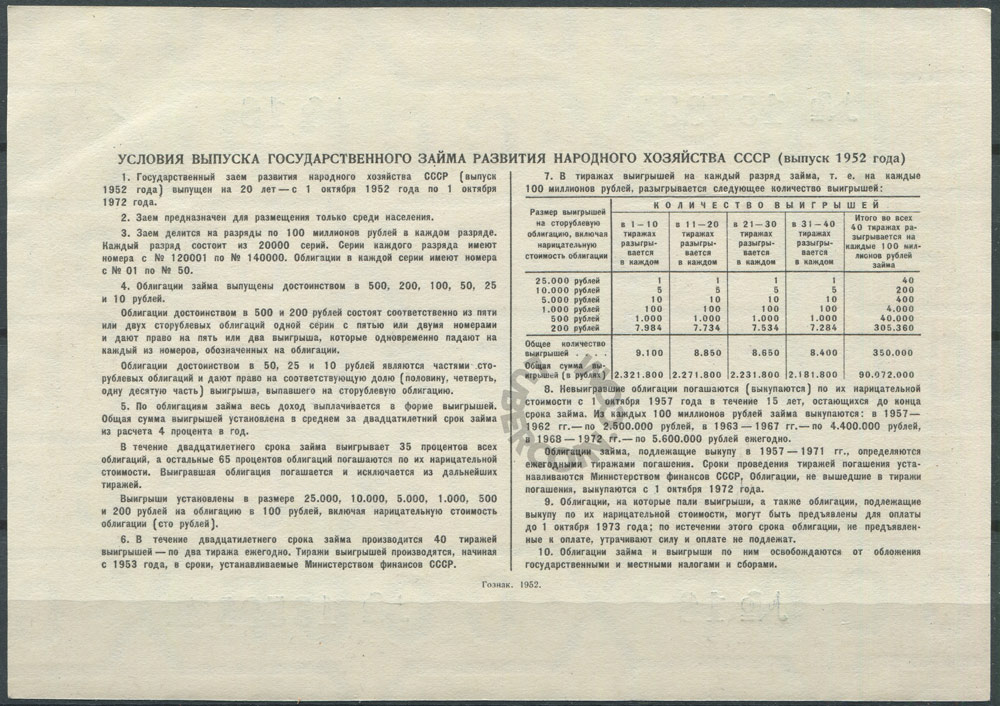 Государственный заем развития народного хозяйства СССР (1952) 100 рублей. Разряд 141. № 1359... UNC