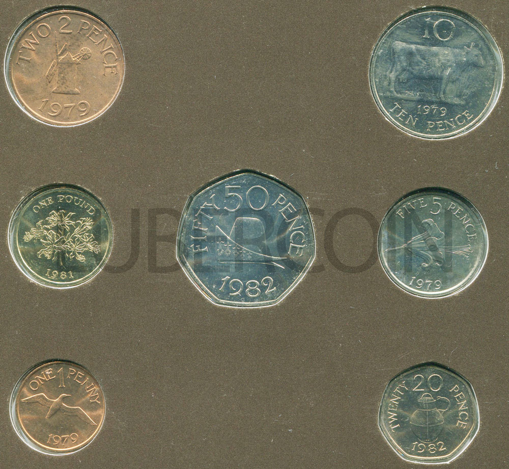 Гернси набор монет 1 пенни, 2, 5, 10, 20, 50 пенсов, 1 фунт 1979-1982 (7 монет) UNC (Патина)