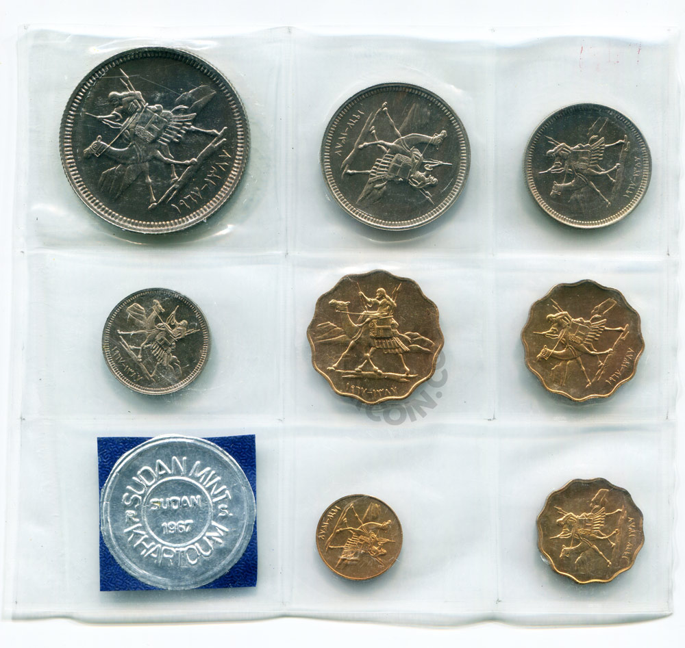 Судан набор монет 1, 2, 5, 10 миллимов, 2, 5, 10, 20 киршей 1967 (8 монет в запайке) UNC (Патина)