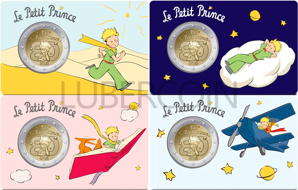Франция 2 евро 2026 Маленький принц (набор 4 коинкарты «Самолёт», «Книга», «Облако», «Пустыня») UNC