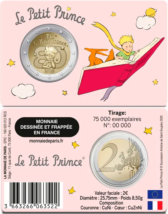 Франция 2 евро 2026 Маленький принц (Коинкарта «Книга») UNC