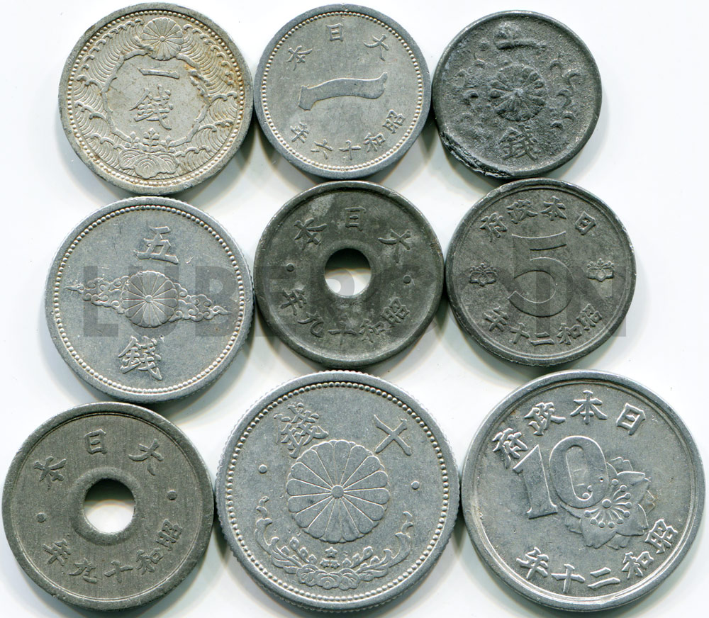 Япония набор монет 1, 5, 10 сенов 1938-1946 (9 монет)