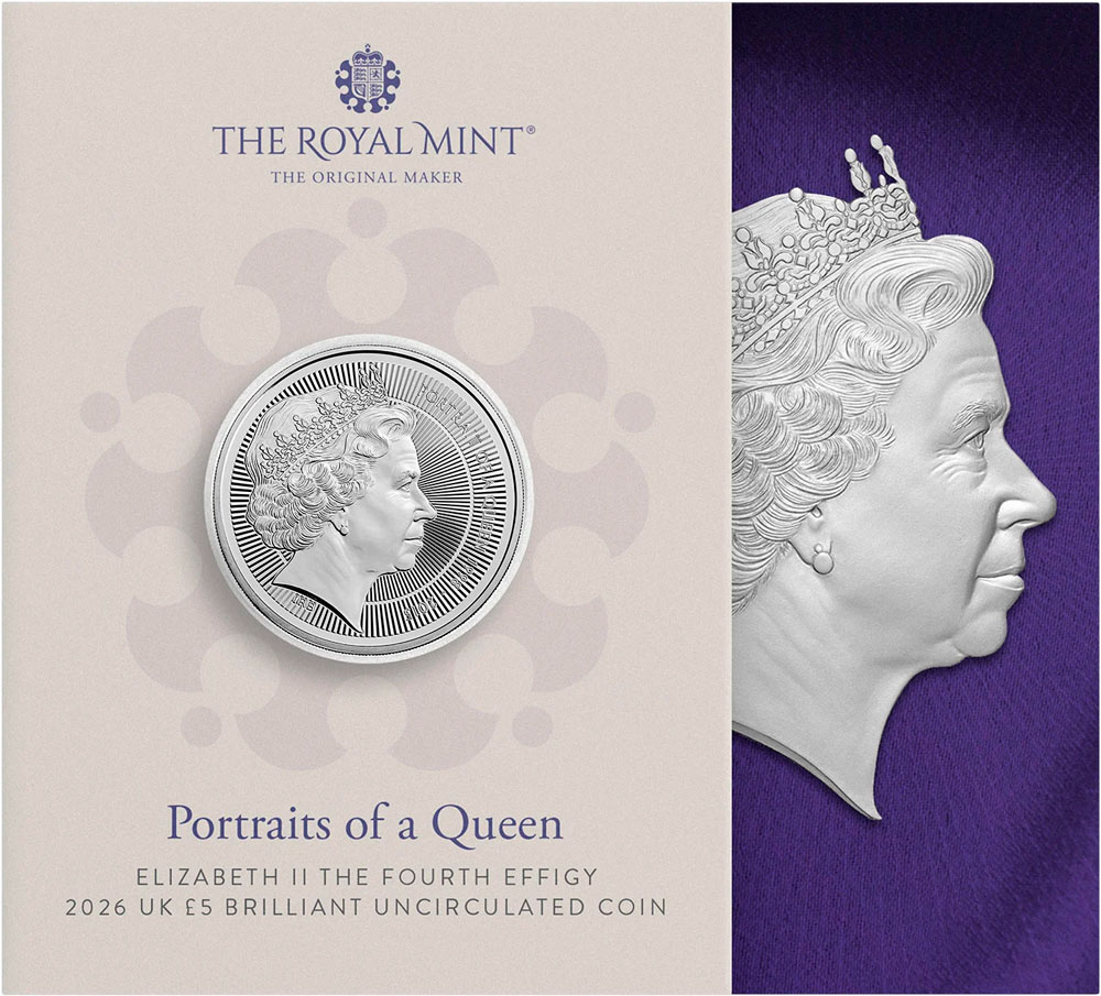 Великобритания 5 фунтов 2026 Елизавета II — Четвёртый портрет (Монета в оригинальном буклете) BU