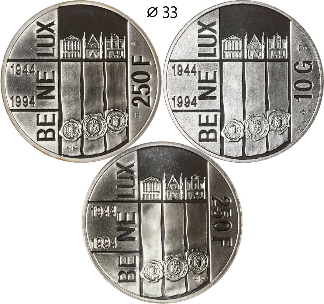 Бельгия, Нидерладны, Люксембург набор 10 гульденов, 250 франков 1994 БеНиЛюкс. 50 лет (3 монеты)