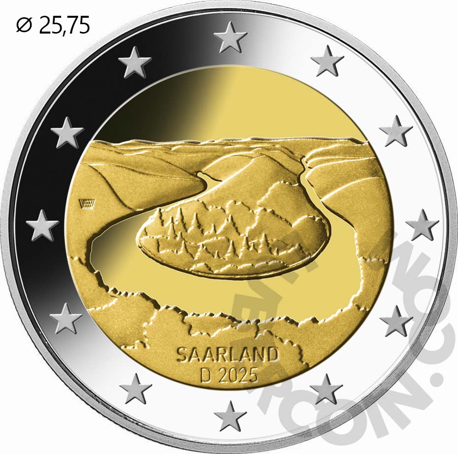 На монете изображена Петля Саара. Самое живописное и туристическое место в Сааре расположено на границе Германии, Франции и Люксембурга. Петля Саара считается символом земли Саар и привлекает к себе особое внимание во время визитов официальных лиц.