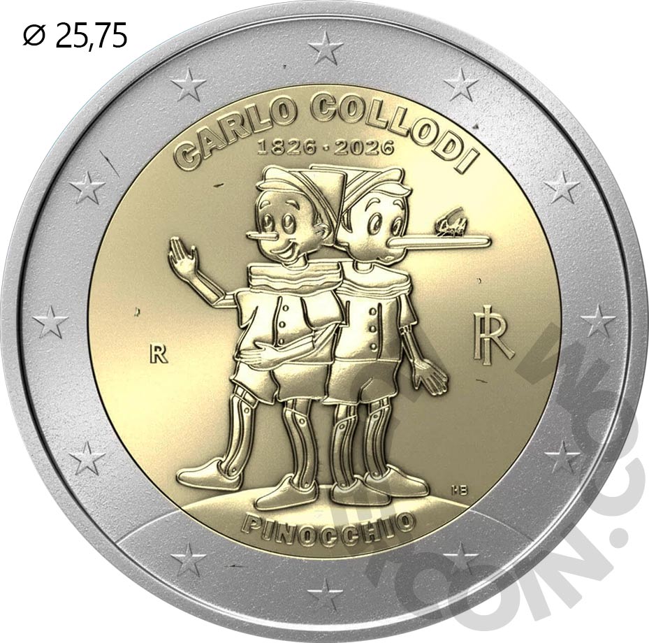 Италия 2 евро 2026 Карло Коллоди. 200 лет со дня рождения / «Пиноккио» UNC
