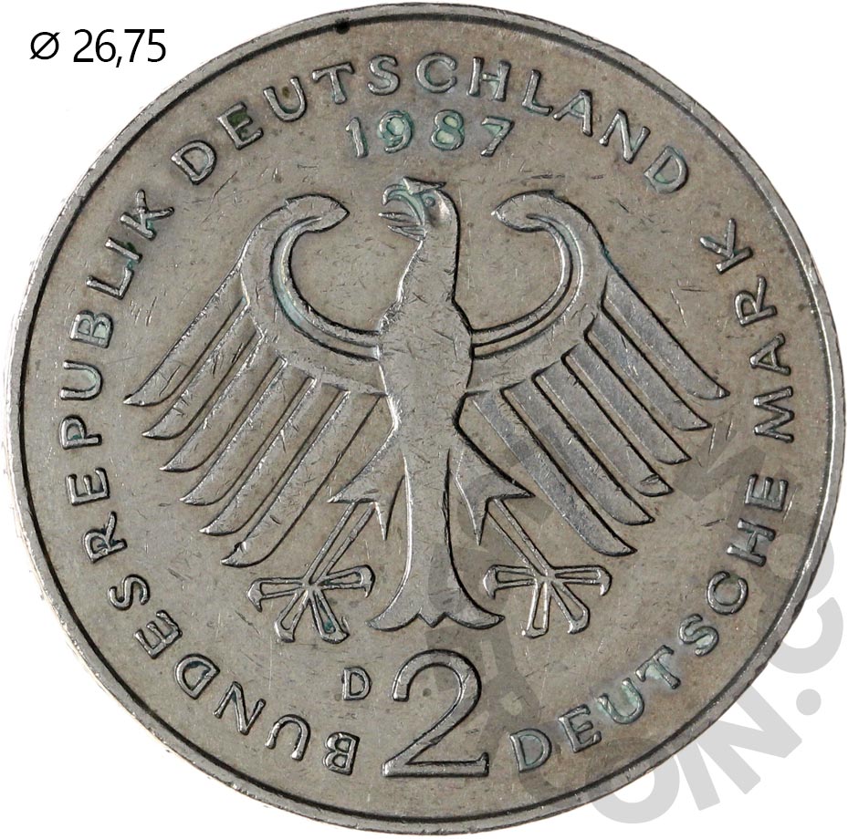 Германия (ФРГ) 2 марки 1987 Конрад Аденауэр D (00047114)