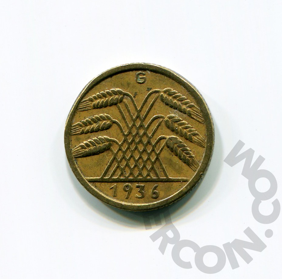 Германия (Веймарская Республика) 10 рейхспфеннигов 1936 G (Дефект на гурте) (00039830)