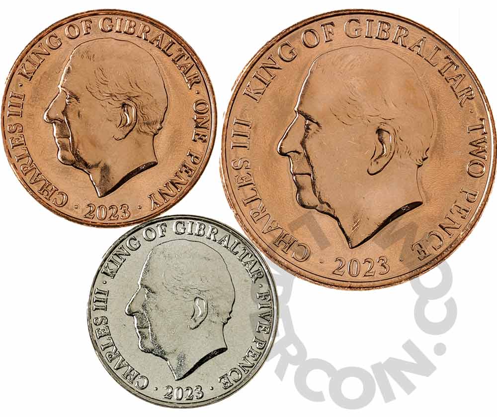 Гибралтар набор монет 1 пенни, 2, 5 пенсов 2023 Коронация Карла III (3 монеты) UNC