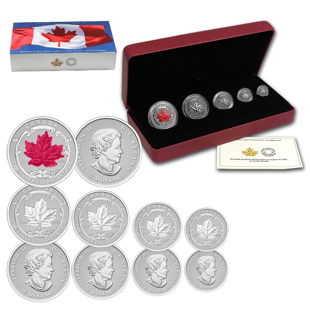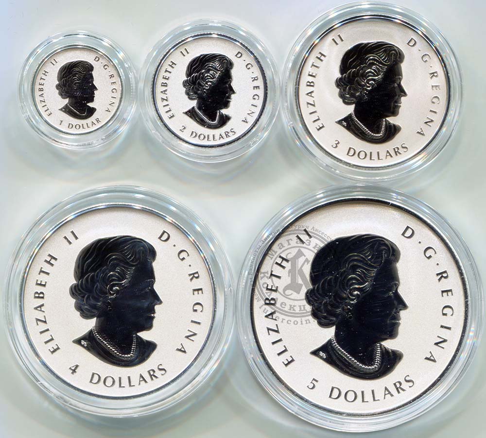Канада набор монет 1, 2, 3, 4, 5 долларов 2015 Кленовый лист (5 монет в оригинальной коробке) UNC