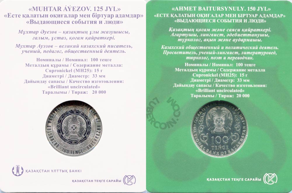 Казахстан 100 тенге 2022 Мухтар Ауэзов и Ахмет Байтурсынов (2 монеты) BU
