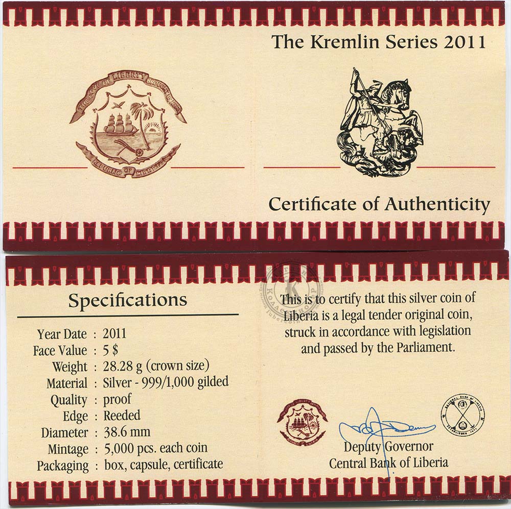 Либерия набор монет 5 долларов 2011 Московский Кремль (6 монет в коробке) PROOF