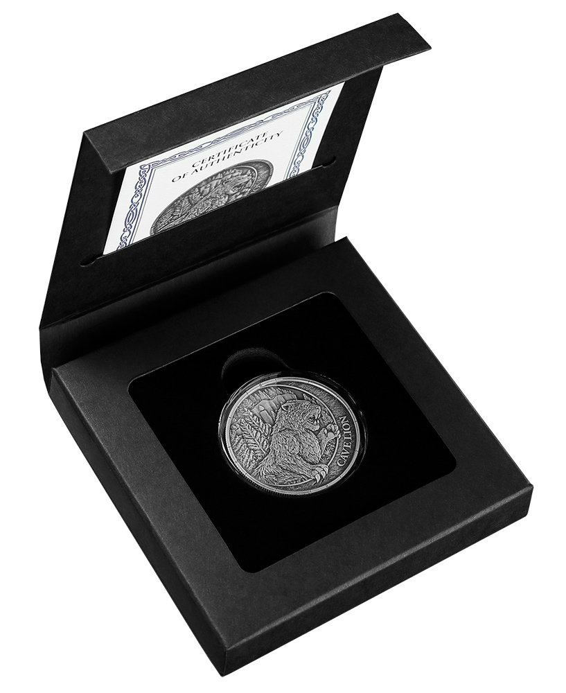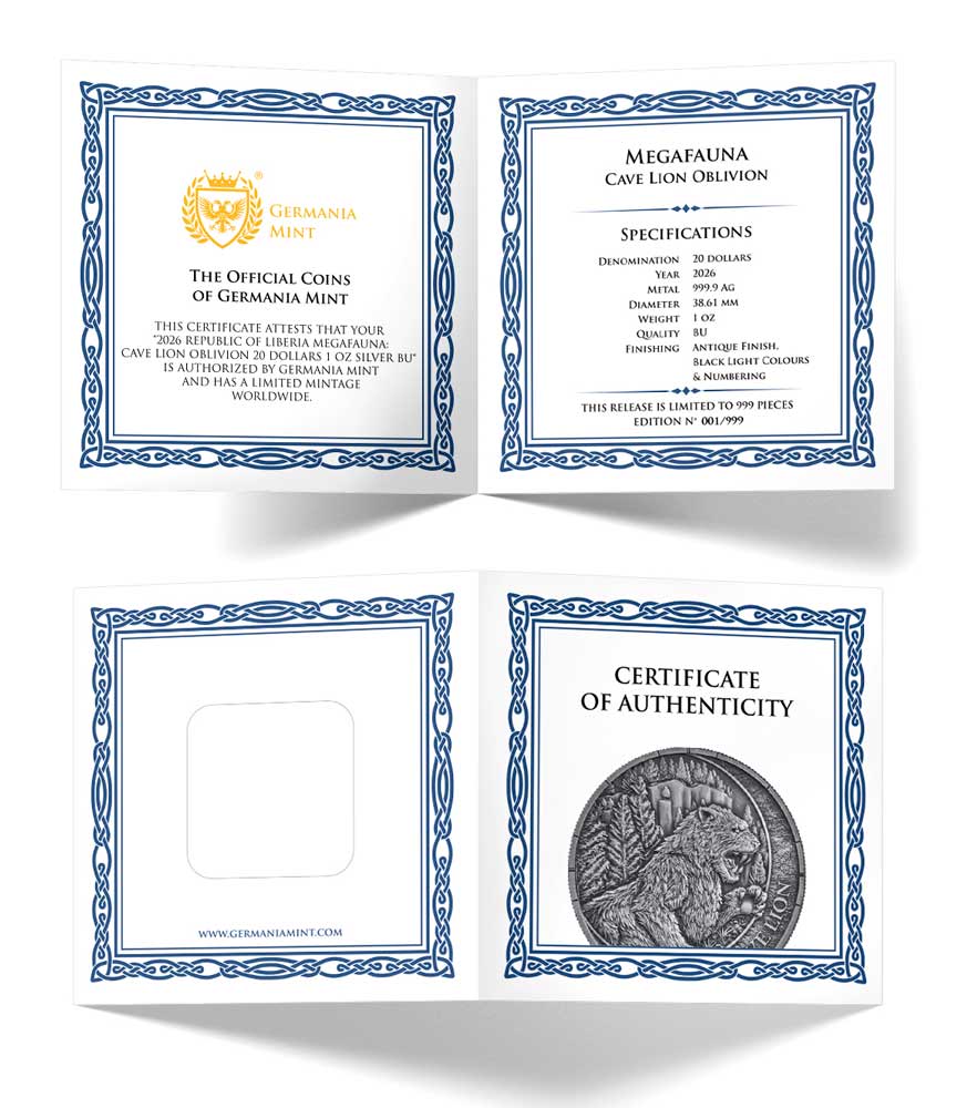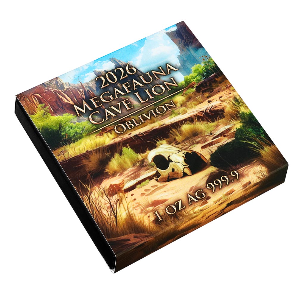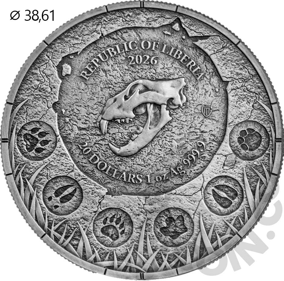 Либерия 20 долларов 2026 Мегафауна — Пещерный лев (Цветная (UV) монета в оригинальной упаковке) UNC