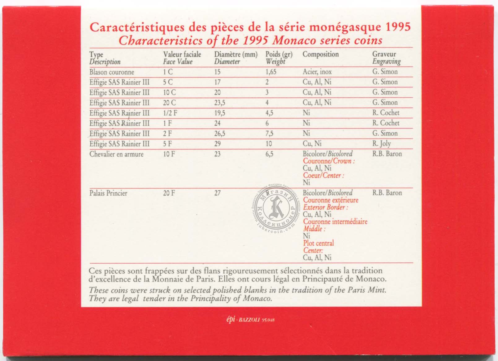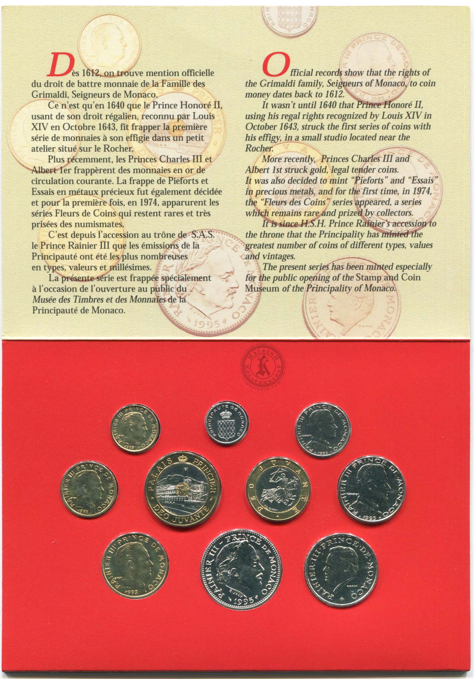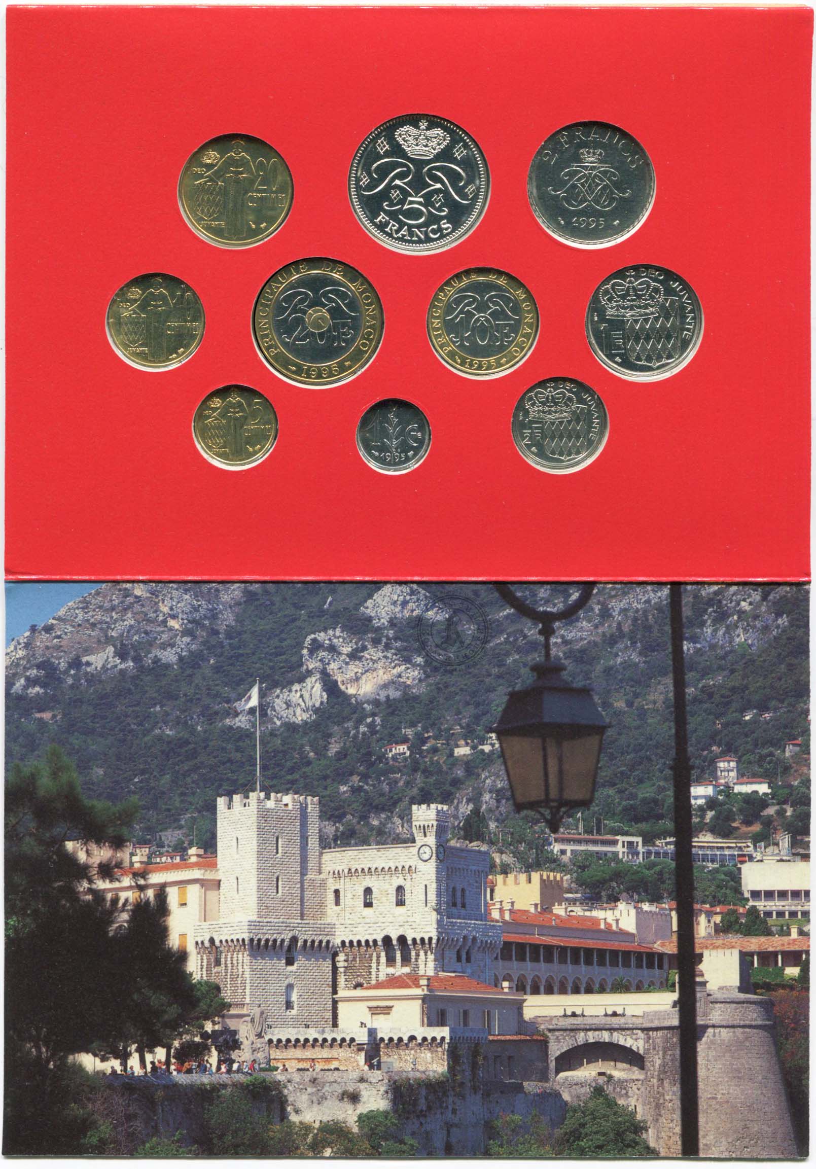 Монако набор монет 1, 5, 10, 20 сантимов, 1/2, 1, 2, 5, 10, 20 франков 1995 (10 монет) UNC