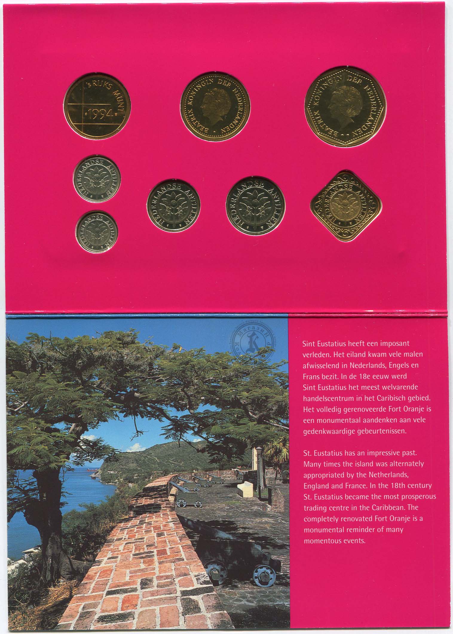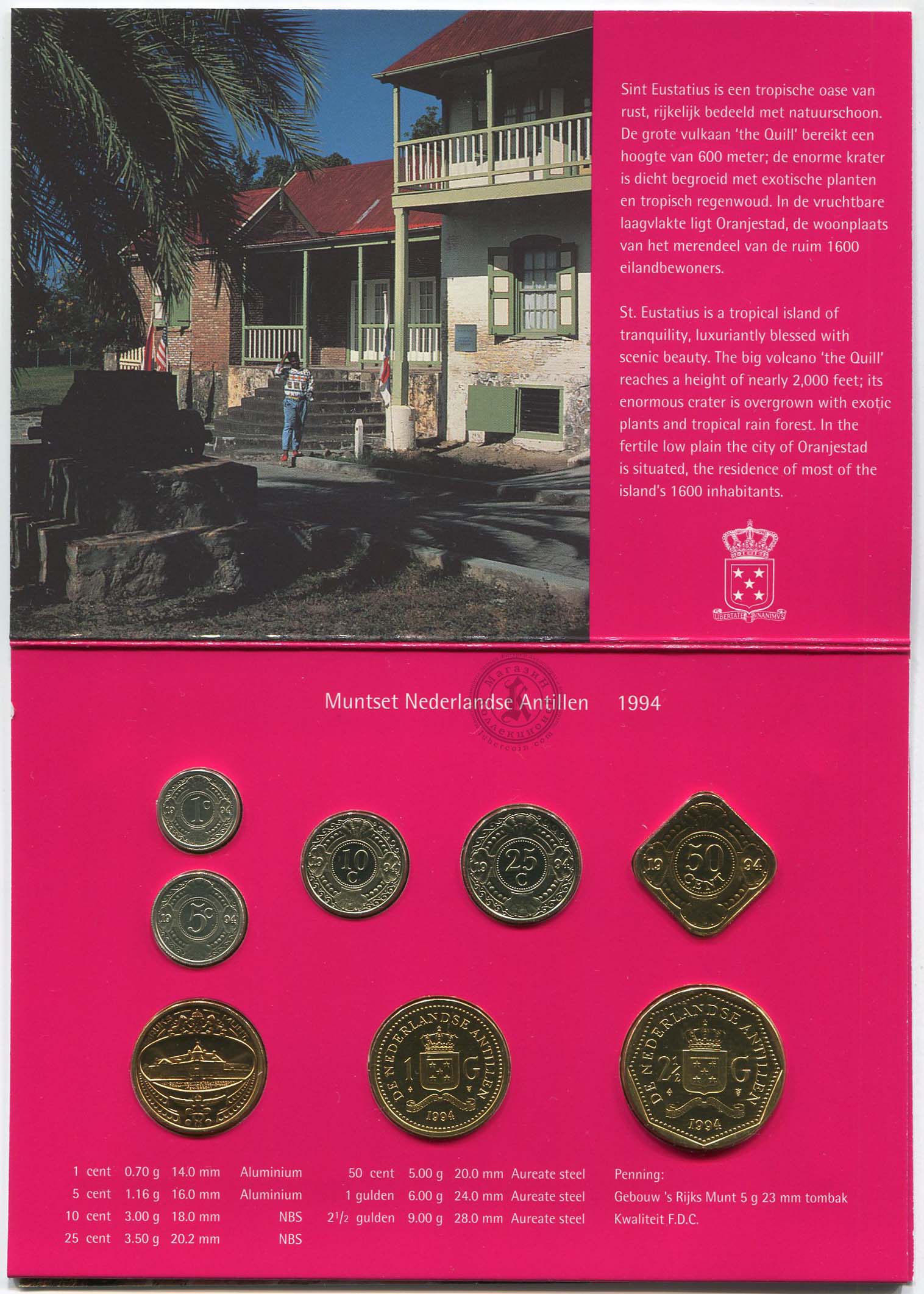 В наборе 7 монет Нидерландских Антильских островов. Это все монеты регулярного чеканы, выпущенные в 1995 году. В наборе также есть жетон Королевского нидерландского монетного двора.