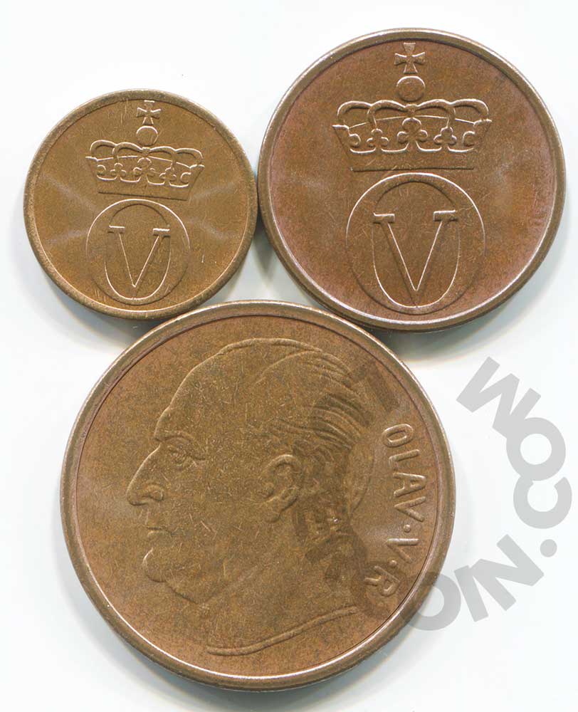 Это не полный набор монет времен правления короля Улафа V. Это три самых маленьких номинала. Также это единственные монеты того времени, изготовленные из бронзы. Другие номиналы чеканили из медно-никелевого сплава.