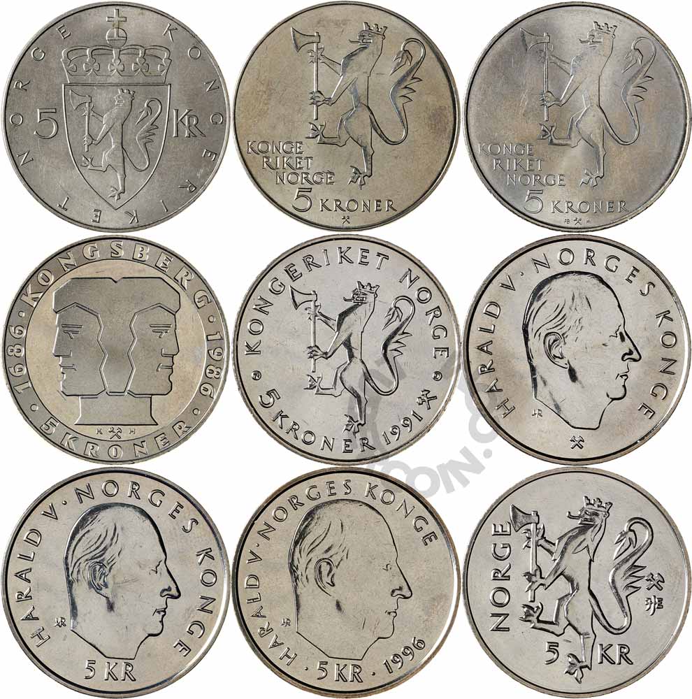 Это все юбилейные монеты Норвегии номиналом 5 крон.